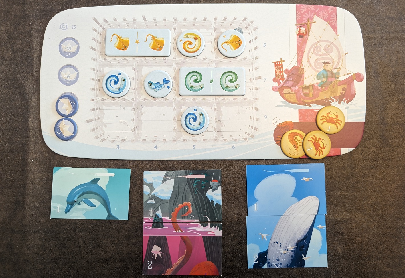 So what are players actually doing along their journey? The spaces along each boat’s journey are referred to as stations, each with a minigame to consider. The “angling station” and the “net casting station” both focus on the players’ fishing boats. Within the boats are spaces that can store fish and if players make rows or columns of fish that are the same type or color they will score the points listed along their board. These two stations center around the fishing minigame that will have players doing their best to fill their boats with specific fish for as many points as possible. The “crustacean trap station” features a push-your-luck minigame where a player can keep pulling tokens out of a crustacean bag, but if they pull a second crab they lose their entire catch. (I think the crabs get pinchy.) Players begin with four offering tokens on their boat and if they don’t take the time to offer them back to the sea by visiting the “whirlpool station”, they will receive negative points at the end of Namiji. There are three different “panorama stations” where players will begin painting a panorama. Each panorama is a different chain of points with a bonus for being the first to complete a panorama. “Sacred rock stations” offer a player a choice of one of two secret objectives that could score them extra points at the end of the game.
