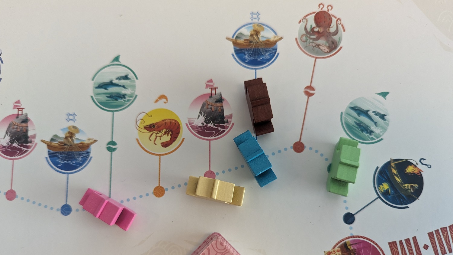 With the options laid out for your journey, how do the pieces come together? The “stations” offer minigames that players will have to balance in order to score well. Players can’t focus on everything and your choices change from turn to turn, forcing players to adapt. There is a fair amount of randomness in Namiji. Fishing can yield tokens that aren’t helpful and players can immediately pull two crabs out of the crustacean traps, making them score nothing. (You can stop at the one crab token, but who does that?) The sacred rocks and docks can also have choices that might not be useful to a particular game plan. Even if that happens players can change their strategies mid game, but it’s possible to end up with choices that simply don’t help you as much as what the other players are finding.