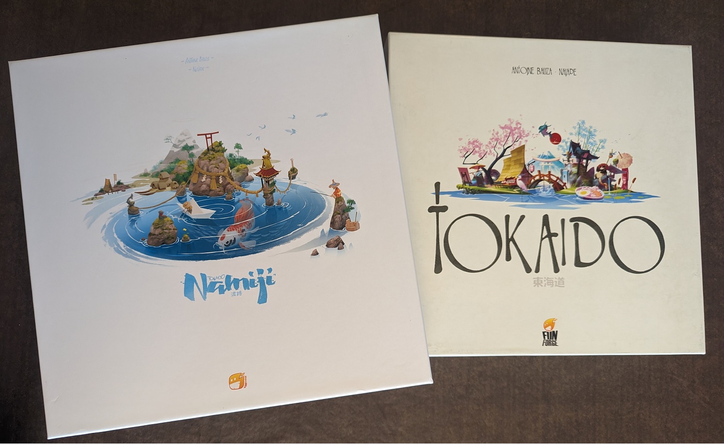 Namiji is the second game in a line following Tokaido released in 2012. Namiji’s central movement mechanism is a direct copy of Tokaido, but Namiji changes up the options with the stations available. Namiji updates a few rules as well, such as when players arrive at docks players can choose which space they want rather than it simply being the order they arrive in. While the panorama stations are the same as Tokaido, the rest of the stations in Namiji are new. The two games feel very similar and because of that they play nearly identically. Overall the rule changes Namiji does implement makes Namiji feel like a more streamlined update, but Tokaido is also a wonderful choice for those looking for something light. If you’re looking for more depth, Tokaido currently has two expansions while Namiji currently has one expansion.