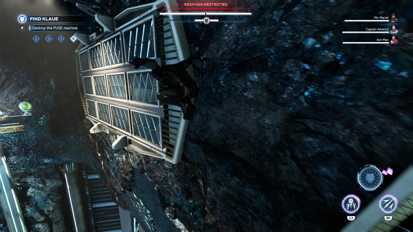 Despite Black Panther’s fun moveset and adding something unique to the roster, combat still lacks any impact. The sound design is pitch perfect, the animations look great and hard hitting, so why do my eyes glaze over when playing this game? I think it may have to do with how your character and enemies react to attacks. Foes are either easy to stun lock or just continue to do their thing, and dodging their fire or even getting hit only leads to a moment of down time before you’re back to mashing square. Despite having vastly different abilities, all the characters’ playstyles boil down to mashing one button over and over. It leaves the game feeling stuck between the simplistic elegance of a brawler and the depth of a character action game.