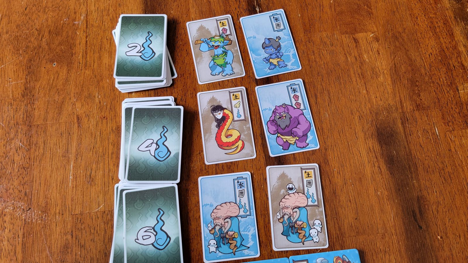 What does this mean for playing through a game of Night Parade? Well, players take turns taking actions based on their sets of yokai. Each player starts with three different scrolls corresponding to the different elements of water, wood, and earth. These elements are the different types of yokai that you can employ in your quest to take the throne of the yokai and become the new yokai king.