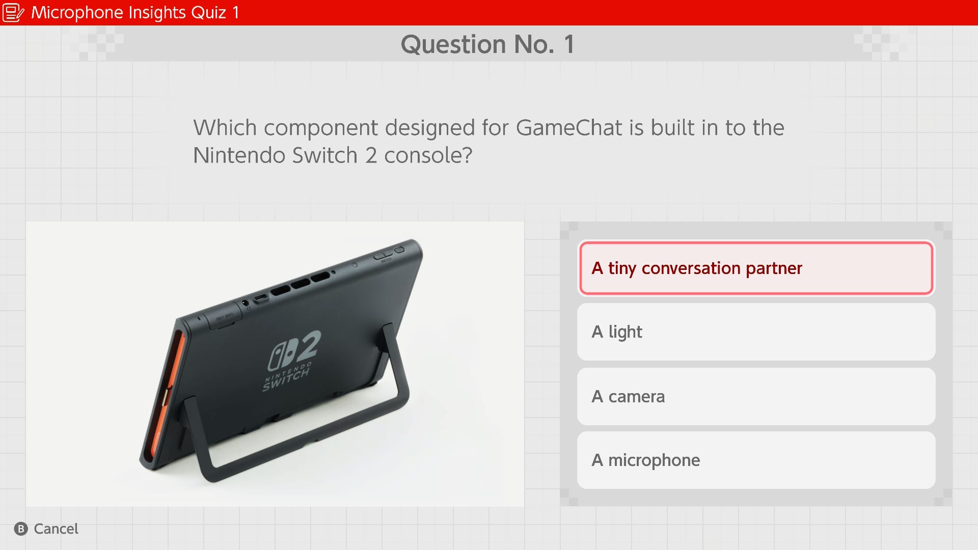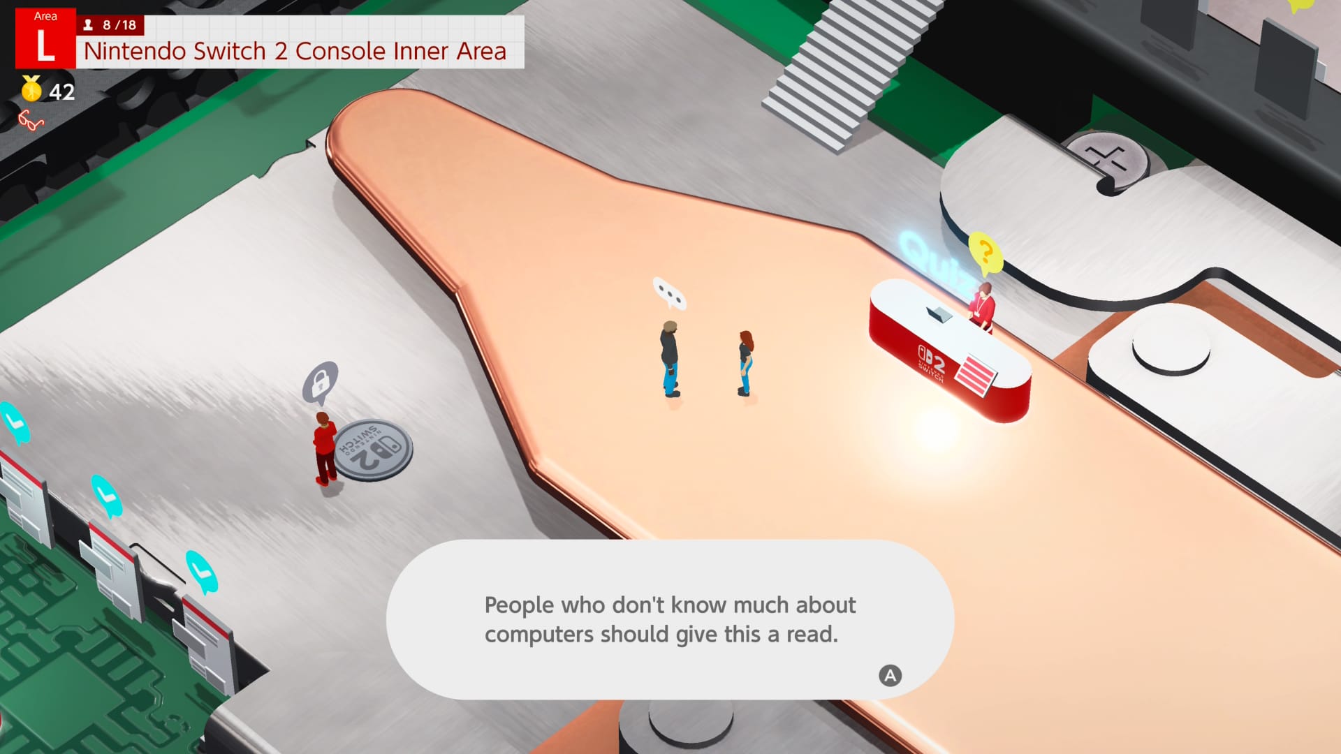 Welcome Tour has you exploring an exhibit all about the Nintendo Switch 2 from an isometric perspective. It’s got a cute, toy-like visual style with your character and other attendees all running around on the console and its peripherals. The game is segmented into areas covering one thing at a time, such as the Left Joy-Con 2 or the inside of the console itself. Each area has a selection of minigames, quizzes, technical demonstrations, and stamps to play, complete, and collect. The only thing you really need to open up the next area are the stamps: collect all of them in area A to move on to area B and so on. What makes this difficult is the fact that stamps are hidden until you move within a very small circle around them, so you have to intuit what parts of the device are noteworthy, like the ABXY buttons or a headphone jack.
