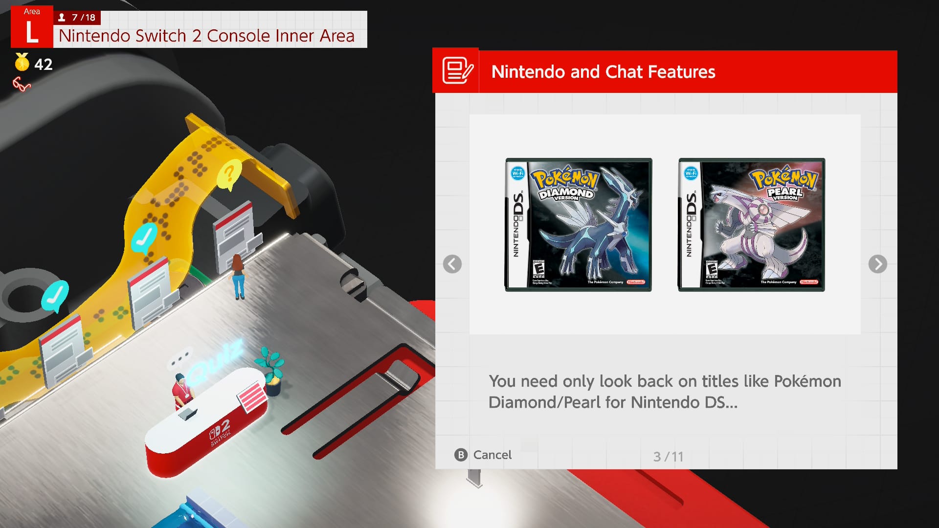 Just going after the stamps will get you to the end, but it’s the least interesting part of the game. Instead, you’ll want to linger in each area to experience the quizzes and minigames on offer. As a tech head, the quizzes and tech demos were what interested me the most. You get to read about some specifics on how the technology of the Switch 2 works, and these sections do a pretty good job of explaining fairly complex topics like upscaling, memory vs. RAM, and more. I’ve tried explaining frame rates to my family, for example, and they just don’t understand, but I think seeing this minigame in action would do a much better job of showcasing what it is.