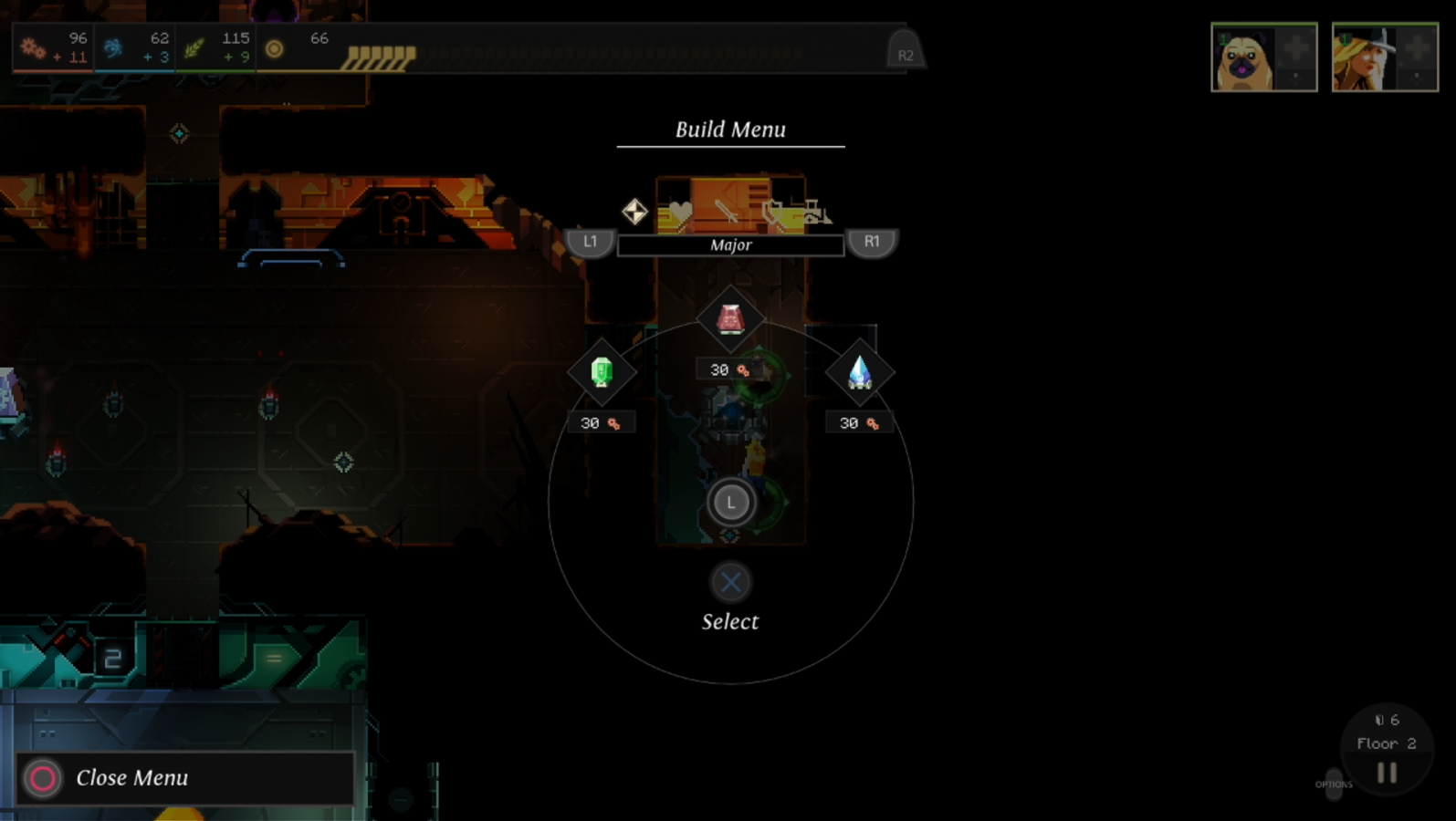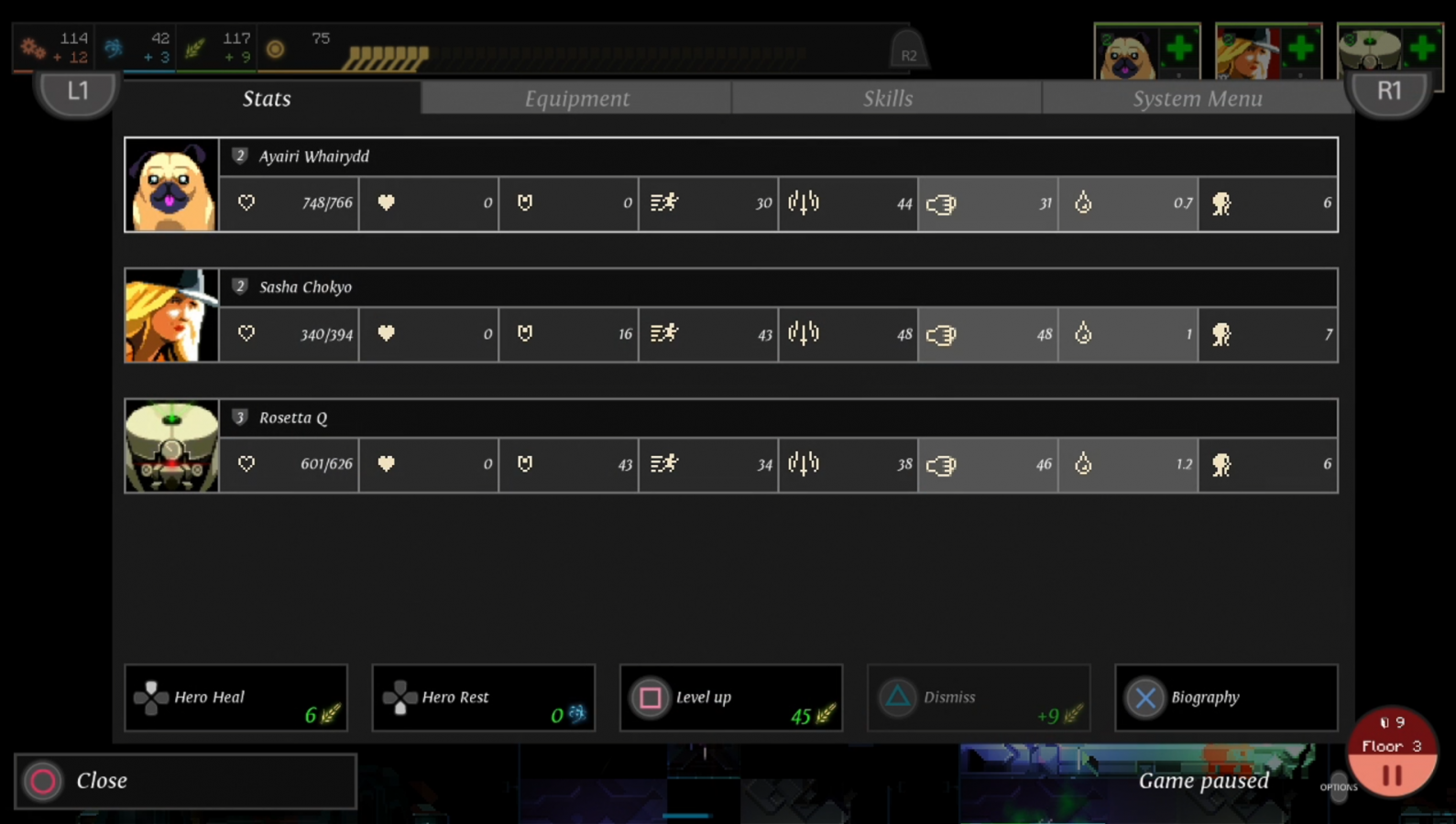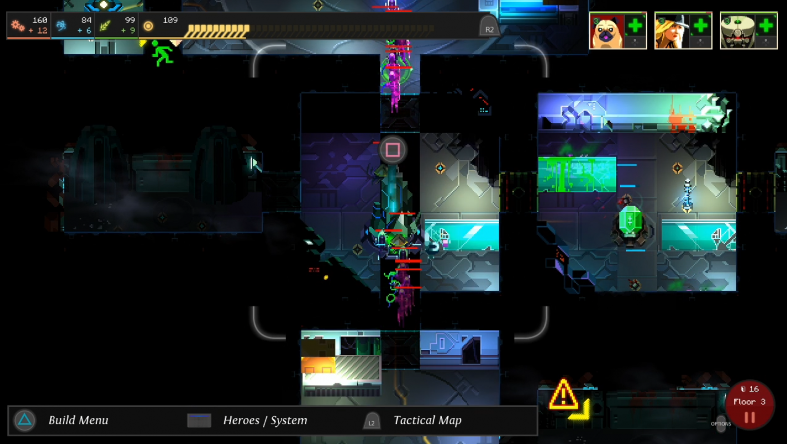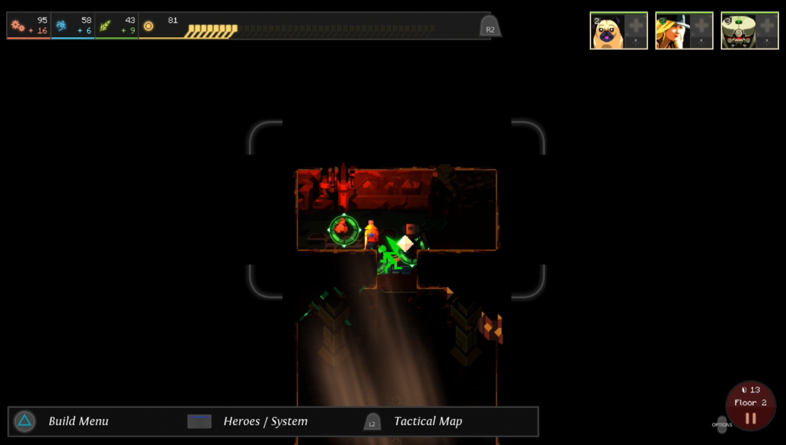 As I just mentioned, you have industry, science, and food points that you earn each time you open a door. Industry points are used to build nodes, big and small, science points are used to research new gadgets or upgrade current ones, and food points are used to heal characters, level them up, or recruit new teammates that you find in the dungeon. You can spend a small amount of food to heal individual characters by going to the heroes menu, hovering over who you want to heal, and pressing down on the d-pad. If you want to level someone up, you do the same thing except you hit the triangle button instead of the d-pad. Leveling characters up takes a lot more food to do, and it continues to raise in cost as they get higher in level. It’s definitely worth it since it raises some of their stats such as max health, strength, and speed for the remainder of that run. For this reason alone, I’d also recommend building food fabricators when you can. You have to find a good way to balance what resource you want more of based on what you want to bulk up on. Do you want to build as many gadgets as possible? Go for industry. Do you want a wider variety of powerful tools? Prioritize science. Do you want your characters to do the heavy lifting? Gather up some food. No matter what you do, you need to plan carefully and not get cocky.