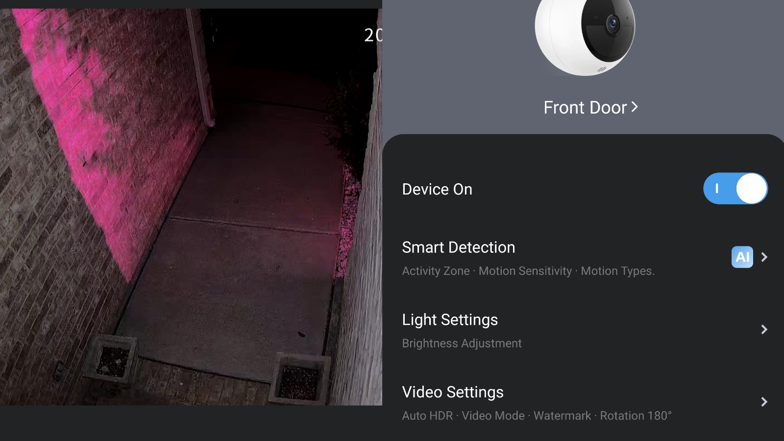 - Video Settings (Auto HDR, video mode for full color or night vision, watermark, and 180 degree rotation if you mounted it upside down)