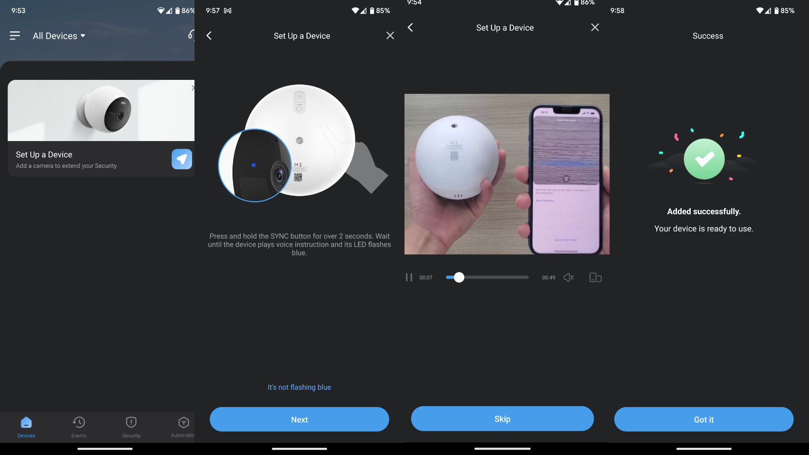 First up, obviously, is configuration. Like most devices, it’s set up with a combination of Bluetooth and a mobile device like a tablet or phone. On the Google Play store or the Apple App store you’ll find the Noorio App – I’ve linked them there for your convenience. Opening the app you’ll click “Set up a Device” – no surprises here. On the back of the packaging, or on the back of the devices themselves is a QR code. Using the app to scan it, you’ll hear a loud beep and a video will play to help you get through the rest. The video is surprisingly helpful, including telling you about the voice instructions that you’re about to hear. You’ll create a new location, which is to say, giving a name to your home. Next, you’ll give your camera a name, such as backyard, front door, side door, porch, shed, or a custom one of your choosing. With that settled, you’ll connect it to the 2.4 Ghz band of your network device. The setup instructions will provide you with detailed information about how to press the Sync button to finish pairing the device – you should see it blink a blue light several times, as well as the aforementioned voice instructions to let you know it’s been accomplished successfully.