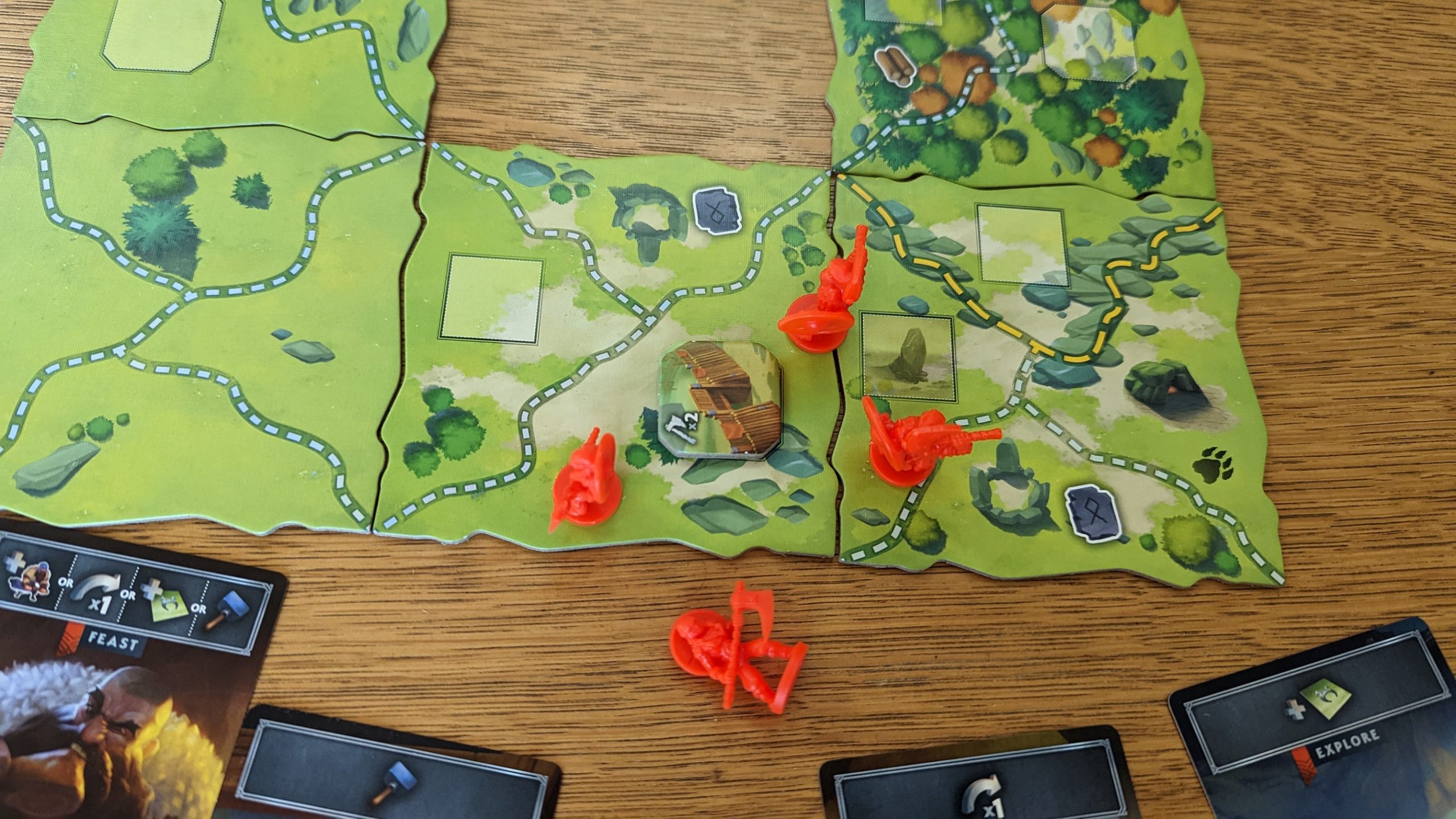 It’s not that I didn’t enjoy my time with Northgard. It has the hallmark high production value of a successful Kickstarter, which is always endearing. The core gameplay conceit is certainly interesting –- Northgard pitches itself as a streamlined 4X with deck building, and all the genre mainstays are incorporated. Players begin the game with a starter deck and a handful of Vikings in their corner of the map and grow from there. Each round starts with players drawing their hand for that round and proceeds with them playing cards from their hand to perform their corresponding actions. These are all straightforward enough: recruit lets you plop more vikings onto the map, move lets you scoot them around between regions, build lets you erect buildings at appropriate sites, feast is a wild card, and the most important, explore lets you draw map tiles in the hope of expanding into a site for the all-important large buildings which players are racing to get three of to win, along with being extremely powerful in their own right.