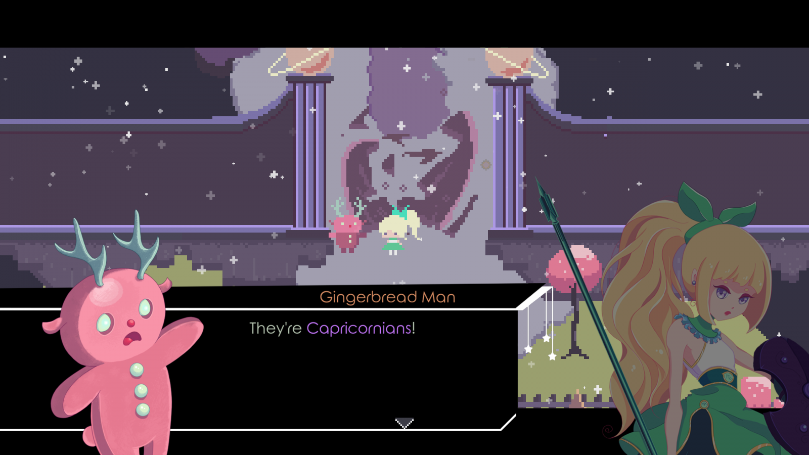 Virgo Versus the Zodiac has you playing the villainous Virgo as she looks to defeat the rest of the Zodiac! Virgo, along with her friend Ginger have set out to realign the Zodiacs and return things to the Golden Age. The story itself is simple, but fun! It’s a great excuse to visit different locations and talk to zany characters. Oh, did I mention Ginger is a living Gingerbread man? Because he is!