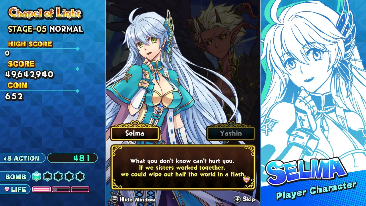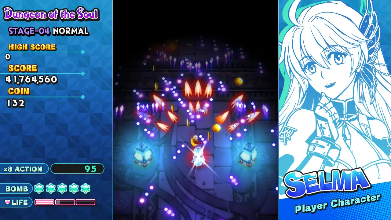 If only the rest of the game had as much love as the quirky characters and story. The main issues with the gameplay is that the movement and inputs feel sluggish and slow. The speed in which your character moves is slow enough to be annoying, and there’s no way to execute a quick dodge. (You’ll also move slower with your summon out, but that’s more of a risk/reward mechanic.) However, there is a very slight delay which will absolutely trip you up when playing anything harder than easy. Sure, we might have performance issues with most games, but in bullet hell shooters, input sensitivity and execution is absolutely necessary for survival. In my normal playthrough with Selma, there were multiple times where I thought that I pressed the bomb button only to get hit because it activated a second later. This lag is inexcusable and might actually be a deal-breaker for some players.