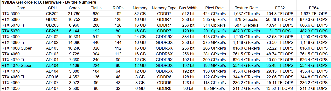 As always, our first stop on the tour is to head under the hood to see where the 5070 lands in terms of cores, speeds, and feeds. Before we do that, let’s just preface this very, very clearly – you cannot directly compare across generations with just the amount of cores or even speeds. The generational differences between cards (e.g. third-gen RT Cores and fourth-gen Tensor Cores in the 4000 series, vs. fourth-gen RT cores and fifth-gen Tensor Cores in the 5000 series) is always less about the amount of cores, but more about what’s being done with them. Let’s take a look: