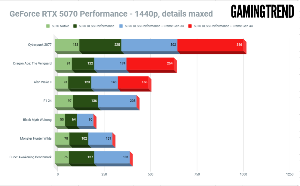 With these numbers we can now answer the question “Is this more powerful than a 4090”. Well, the answer is an unqualified “sometimes”. Probably not as definitive as you were looking for, but in a lot of circumstances, when aided by AI, yes – this card can actually topple the last generation king. Let’s be realistic, though – you aren’t replacing a 4090 with a 5070, are you? More likely you’re running an RTX 3070, 2070, or even the venerable 1080 Ti. Does this card outperform those cards? All day, every day, rasterized or otherwise – by around 65 to 70% by our measurements for the 3070. Throw in DLSS and it’s not even a conversation.