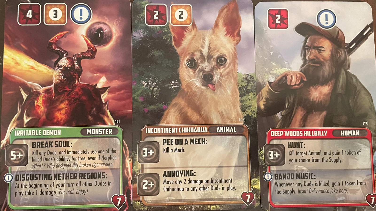 Setup is very simple as the game is primarily composed of cards and tokens. All the Dude cards are shuffled to create a deck full of Dudes (that is a phrase I didn’t think I’d ever say). Each player will then select their color and receive damage markers and a six-sided die. These damage markers will be used to track the damage you deal to other player’s Dudes. Each person will place their scoring token on the scoreboard and you are almost ready to start.