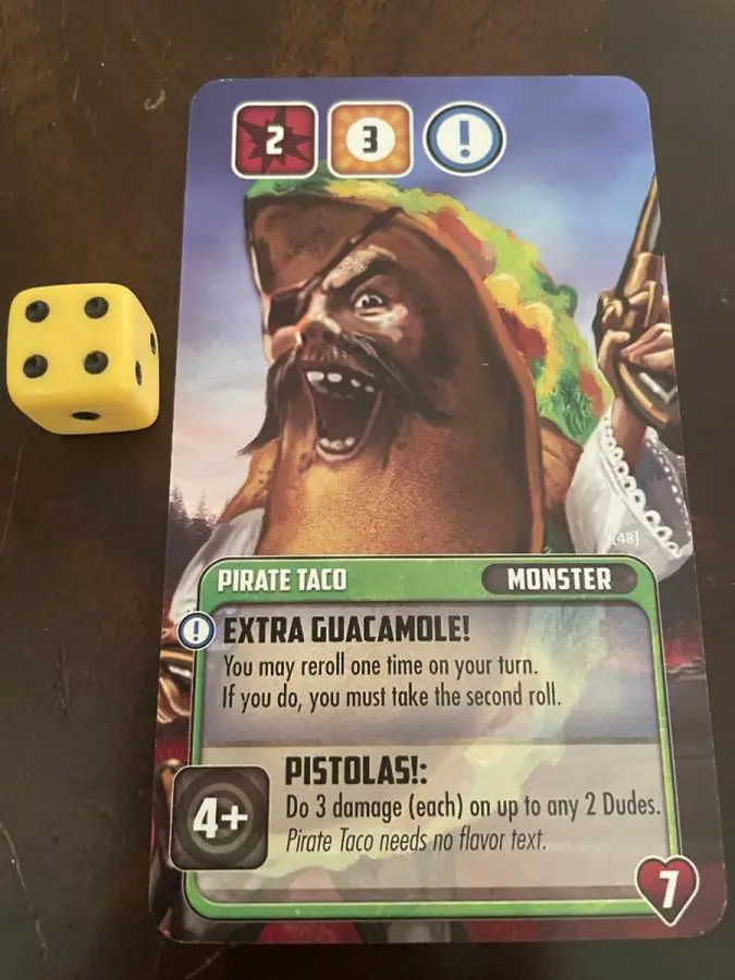 Every Dude has multiple active abilities. Some of them require an exact die number and some require a specific range. Based on your roll you can decide which section of the card you want to activate. The first place you can place a die is on the basic attack which is designated by a red burst. This requires the die roll to be greater than or equal to the basic attack location. When activated, you will deal that basic damage to a Dude. The second place you can assign a die is to the skill power, which allows you to gain tokens equal to the skill requirement as long as you meet that roll. Skills are designated by a yellow space on the card. Finally, there are gray special ability locations where you can truly unleash the power of your Dude. If you can’t activate any of your abilities because you didn’t roll high enough you can take 1 token from the supply. However, if you rolled a 1 and can’t activate anything then you had an Epic Fail and receive 2 tokens as well as being insulted and ridiculed for your bad rolls.
