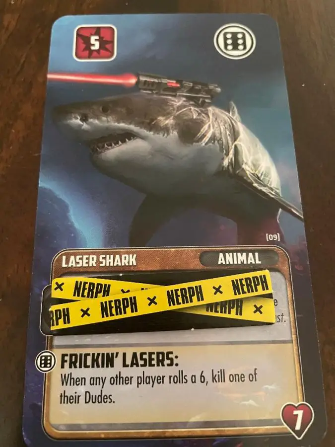 Create a pile of the Nerph and Shield Tokens and give each player one of each. These will be used to protect your Dudes or debuff other Dudes. Each player will also get 3 reroll cubes which will let you, as the name explains, reroll your die once per cube. Each player will get 3 Dudes. The first 3 players will place either 1 or 2 of these Dude cards in front of them to fight for them, and any other players can choose to place 0-2 Dude cards down. There are many when placed abilities and these don’t trigger on this initial setup so this might be a reason to hold on to cards in your hand.