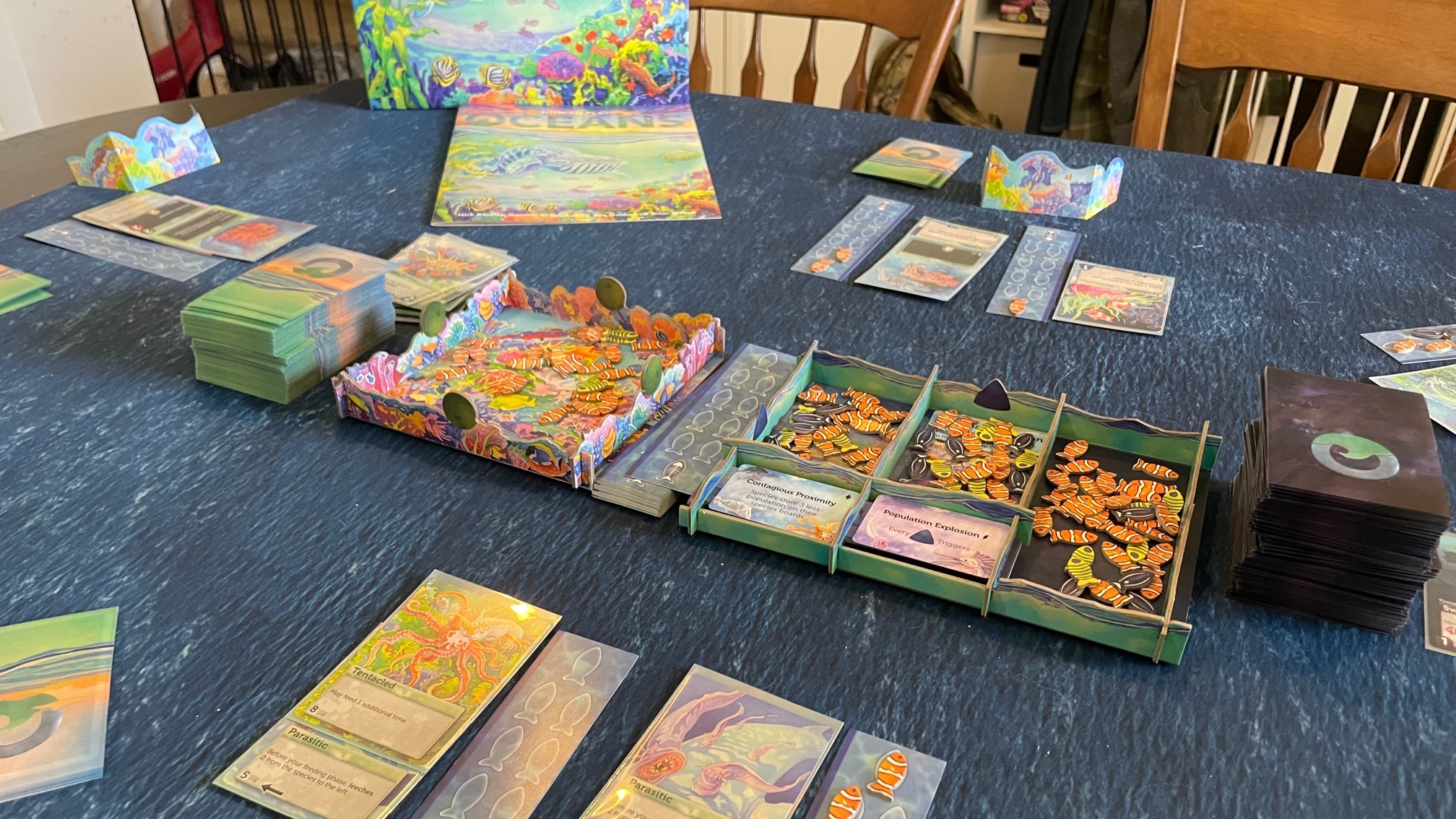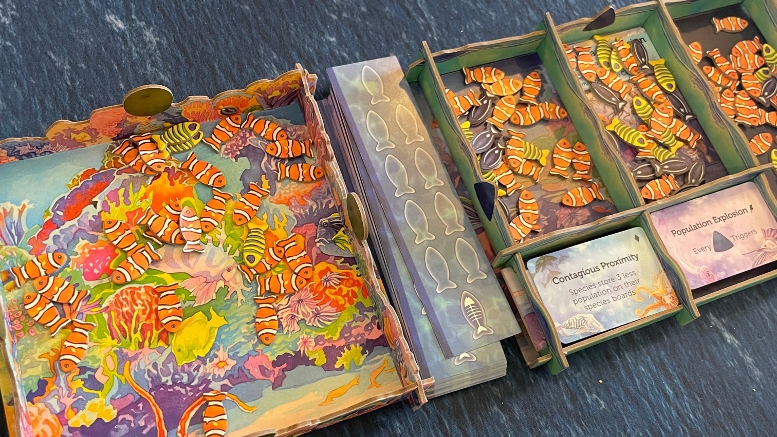 When you open Oceans for the first time, you are treated to a stack of punchboards with hundreds of charming fish of various colors. After you’ve gotten your fill of colorful cardboard fish, you get to the meat (or fish) of the game. 120 cards consisting of 12 different species traits and an additional 89 Deep mutation cards, all of which are unique, make up the bulk of the game. Additionally, each player gets a screen or bag for hiding their collected fish depending on the version of the game you have. The 3D ocean and reef trays constructed in the middle of the table have a nice table presence and contain the components nicely while playing.
