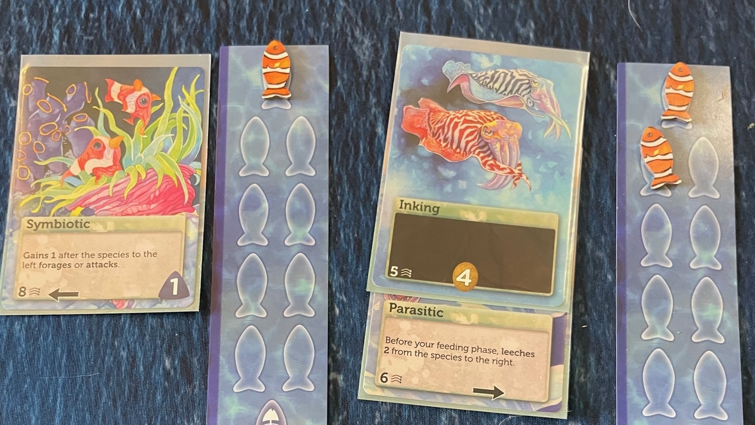 I have really enjoyed my plays of Oceans. The turns are fast and the interaction between the player’s species keeps everyone interested and engaged even on other players’ turns. The 12 different base species provide tons of possibilities for different combinations to build unique species and pursue different play styles. You can go aggressive with predators, create parasites that benefit from stronger neighbors, create fast species that try to score quickly, or highly defensive species that never get taken off the table. Once you introduce the Deep cards, which are all unique, the truly powerful and weird combos emerge. All of these options really give the players room to develop their own strategies and feel clever when they pull off combos.
