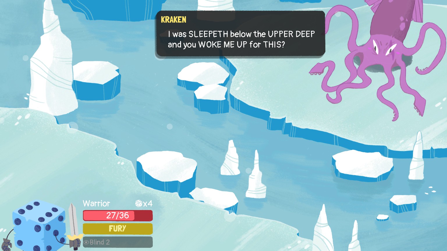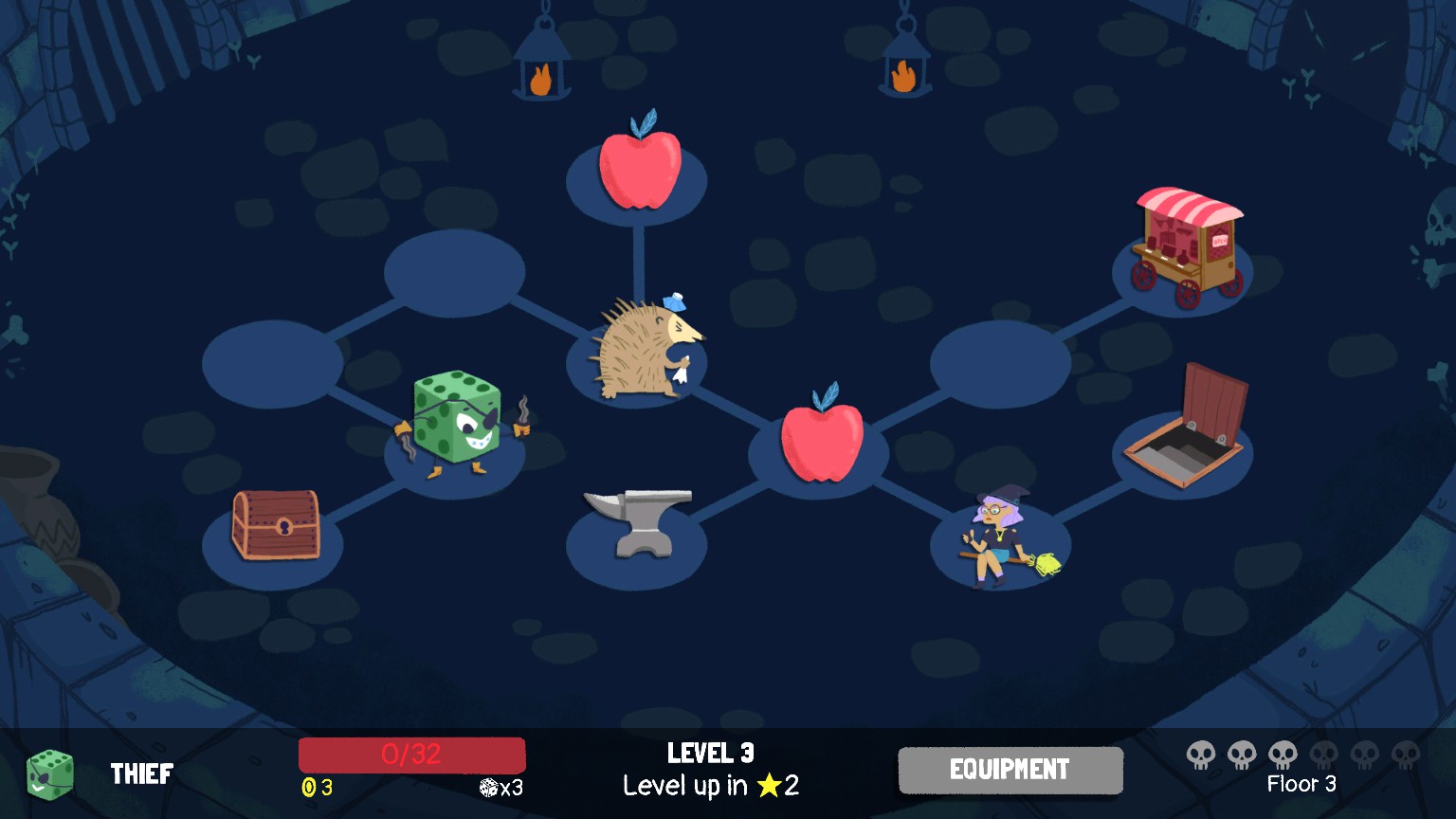 Between battles, you explore the randomly generated dungeons using a simple map screen. You can find chests to get more cards, wagons to shop at, an exit leading to the next floor, and enemies to battle. Planning your route through the dungeon can be as strategic as building your deck: do you risk fighting this enemy to get to the chest behind them, or just make a break for the exit? The game has you constantly making interesting choices which can ripple through to affect the rest of your run. But in a lot of my runs those choices ended up not mattering at all because of a few bad rolls. If you get a few turns with unlucky rolls or the enemy gets a few good rolls, you can go from full health to zero very quickly. This seems like it would incentivize building a diverse deck that can use any dice, but often when I tried that battles would become a slow slog towards my eventual demise because I couldn’t do enough damage to defeat my opponent. Each character can manipulate the randomness somewhat, but in my time with the game it never felt like I could prevent a few of these deaths. It can be aggravating when you have a good deck, only to meet defeat because the enemy forced you to roll all ones. However, the brevity of each dungeon, the absolutely adorable aesthetic, and killer soundtrack all help to keep you from getting too annoyed.