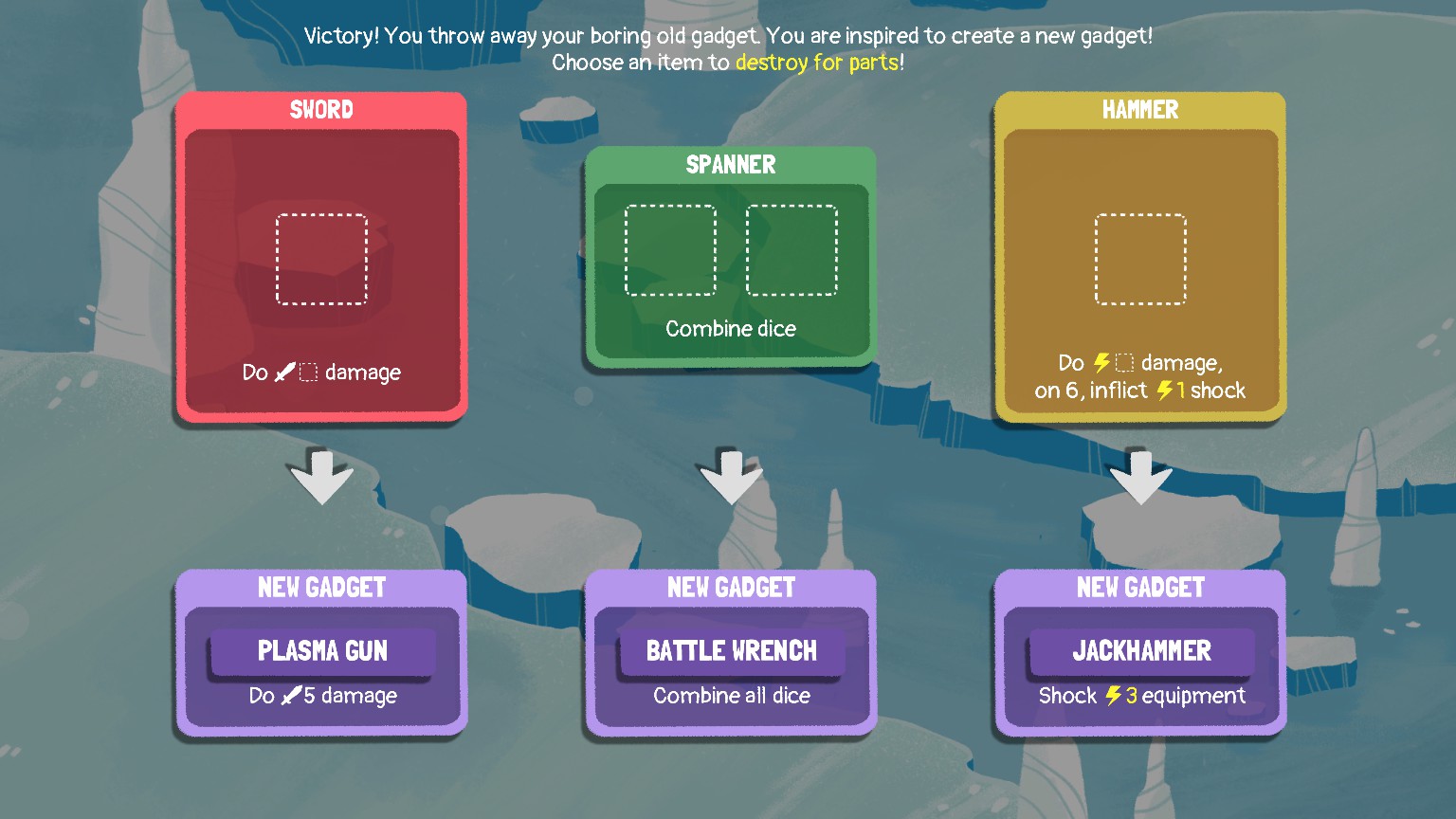 Dicey Dungeons is a gameshow, hosted by Lady Luck, in which the contestants are turned into dice and must make their way through a dungeon. After surviving the dungeon and defeating its boss, the contestants get a spin on the wheel to see if they win their heart’s desire. You can play as six contestants: the warrior, the thief, the robot, the inventor, the witch, or a secret unlockable character. Each has their own special abilities and card pools they can draw from as well as their own set of episodes with unique twists on the normal gameplay. These episodes can vary wildly in difficulty, but the first is usually the easiest and you have to beat that before you can unlock others. Initially, you can only choose the warrior and his first episode, so we’ll use him as an example.