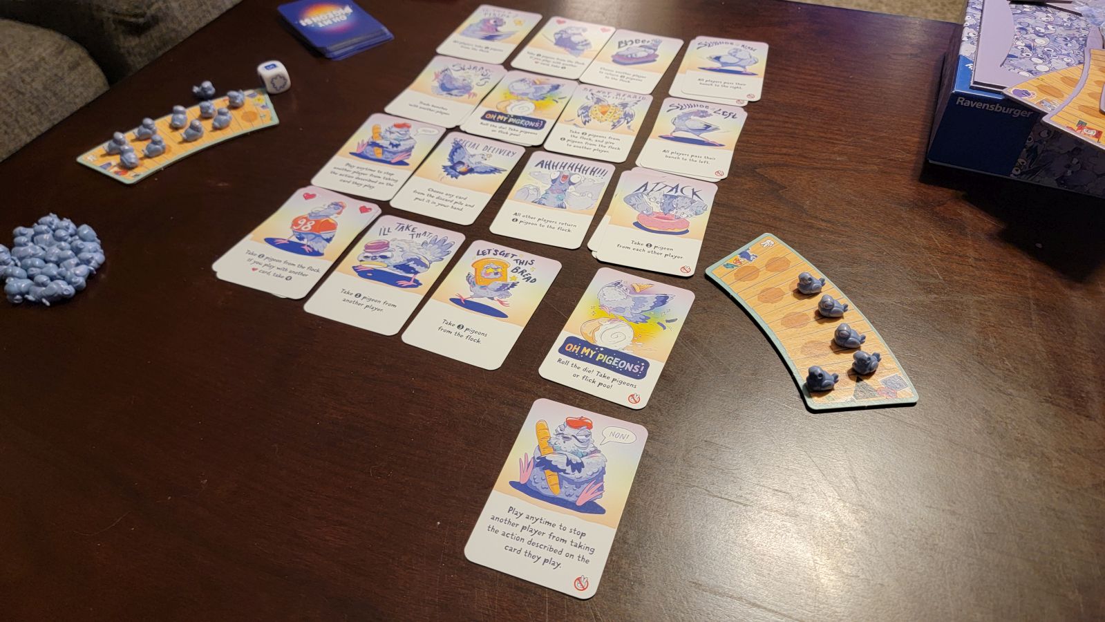 On each turn a player must use one of their cards and do what it says, and then place that card in a discard pile near the deck. Cards may allow you to add to your flock, steal from another player’s flock, trade benches with a player, roll a die, stop a player from using one of their cards, force players to return pigeons to the flock, and more. There is a good variety of cards to pull, and it helps that the cards all feature fun artwork, which often made me laugh as I came across new cards for the first time.