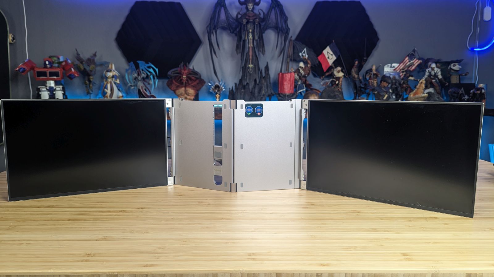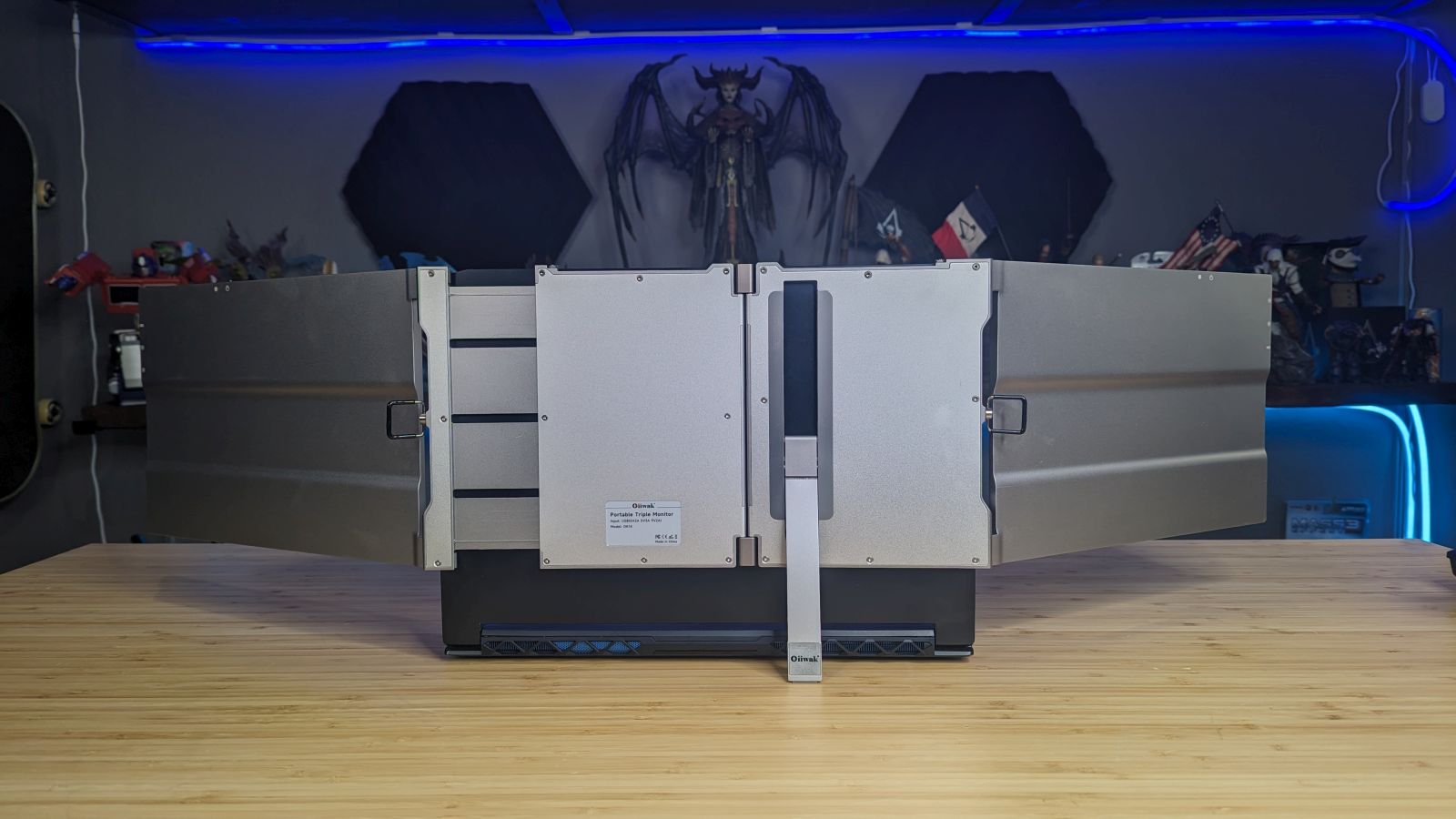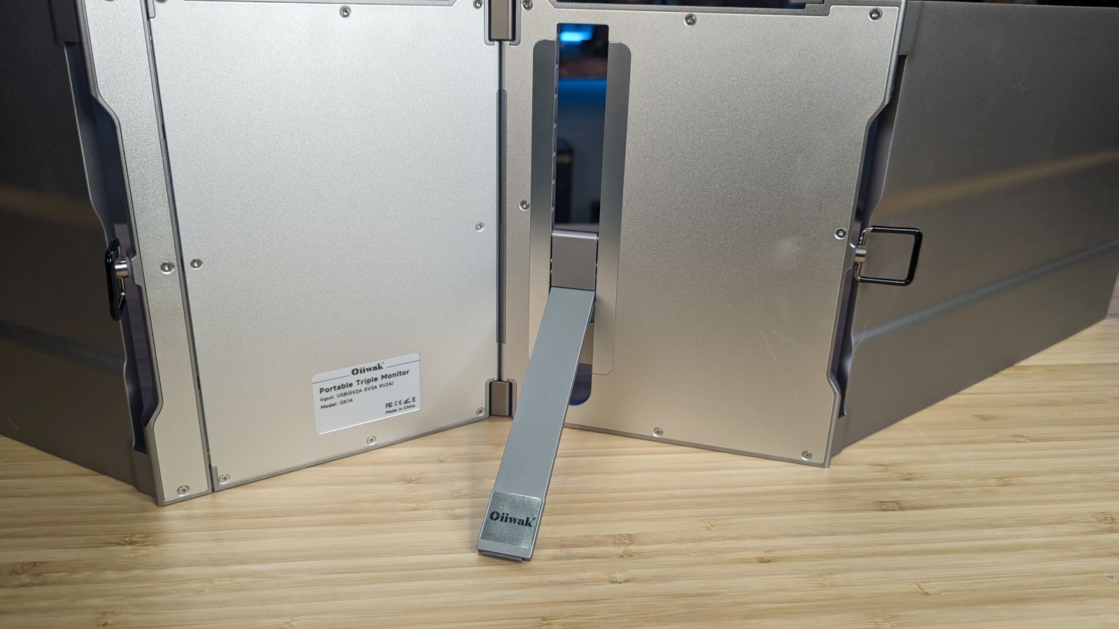 My mobile workstation is an Acer Predator Triton 500 – an RTX 2080 Super-powered laptop with a 15.6″ LCD screen. Using a second screen means lugging out a full-sized monitor, complete with power and connectivity cable. A third monitor is completely infeasible. I’ve used magnetized secondary monitors that slide out, attached with adhesives, but the heat from the monitor rendered the sticky materials on the adhesive unsafe after a few months. There’s nothing quite so invigorating as when your second monitor suddenly flings itself off of your laptop, threatening to take the laptop with it! I needed a better solution. Oiiwak makes a monitor extender that not only uses a mechanical connection rather than an adhesive one, but also bumps the number of monitors up to three. Could this be the holy grail of portable multi-monitor productivity? Time to find out.