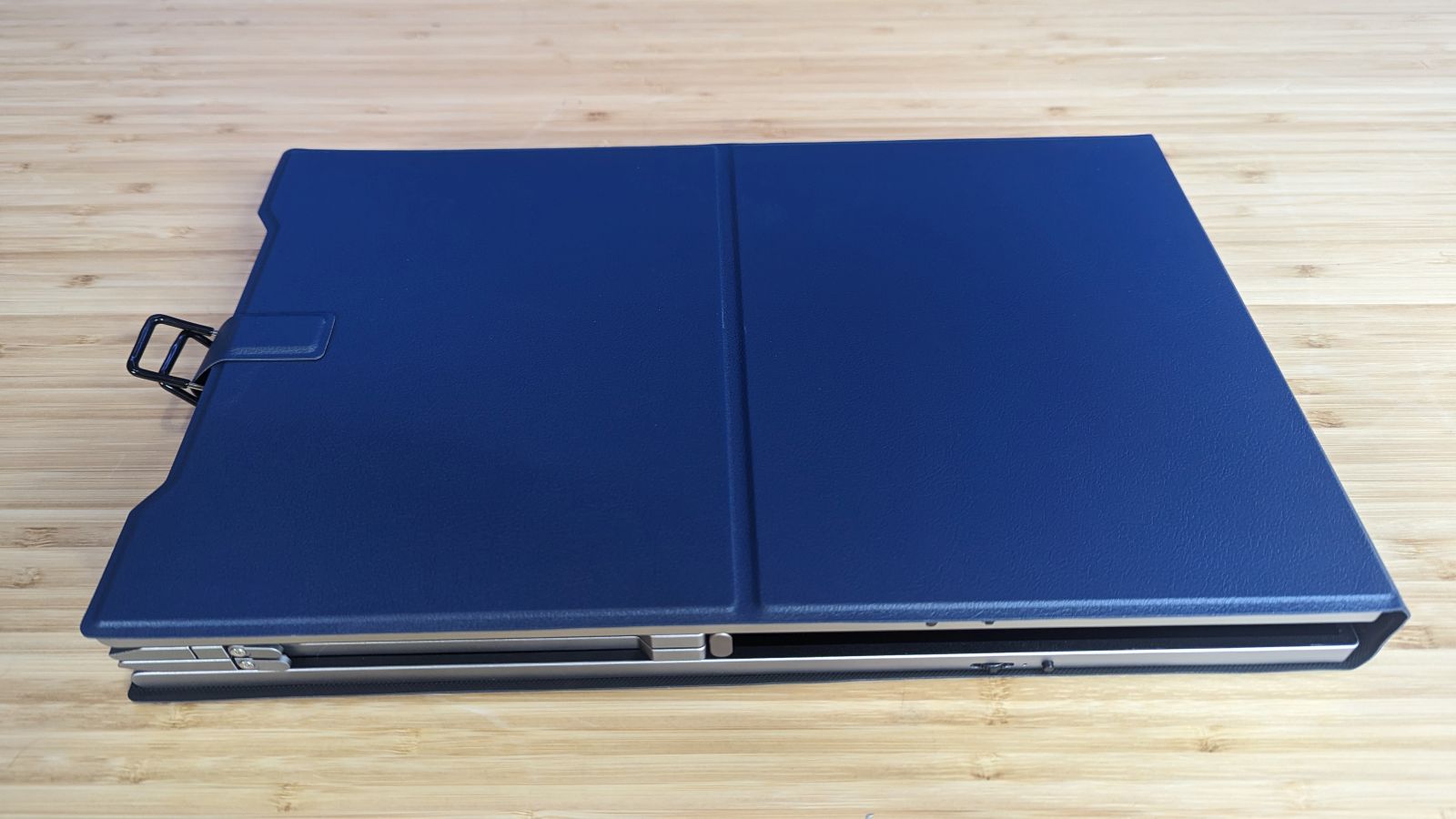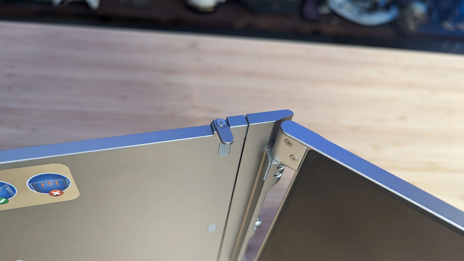 Opening the magnetized cover latch, the aluminum chassis will open via the central hinge joint, revealing the two monitors on each side. This chassis has two D-rings on the rear which you’ll use to open the spring to stretch it to fit your monitor. This model will fit anything from a 13″ to a 16″ laptop screen. On the rear of the case you’ll find a kickstand as well. On the top of the chassis you’ll find two small arms that will open, resting the device on top of your central monitor. Unfolding the screens and using the D-rings, I was able to easily unfold and place the entire device without an issue. Let’s talk about the kickstand because, surprisingly, it’s a stroke of genius.