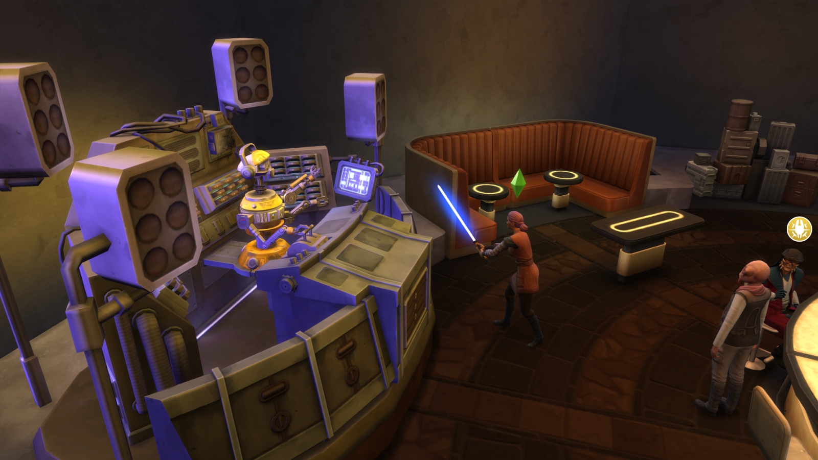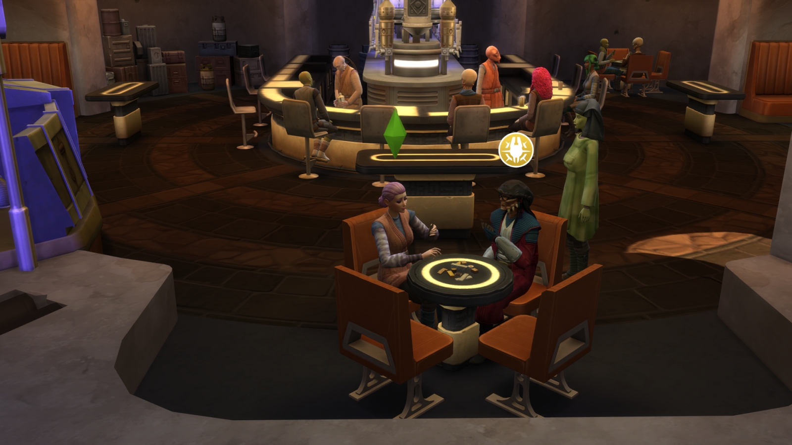 At Oga’s Cantina, I met up with Hondo Ohnaka (Clone Wars!), the lead contact for the Scoundrel faction. To add to my immersion even more, I had to challenge him to a game of Sabacc. We sat down at a table right by DJ R-3X, and listened to his awesome jams, and my heart was content. You can challenge other Sims to play you in Sabacc, and earn some pretty decent cash while you’re at it. Speaking of money, you use a different currency on Batuu, which of course would be Imperial Credits. Your household funds are safe and sound back home, so you’ll have to earn yourself some Credits via quests, or Sabacc if you’re lucky.