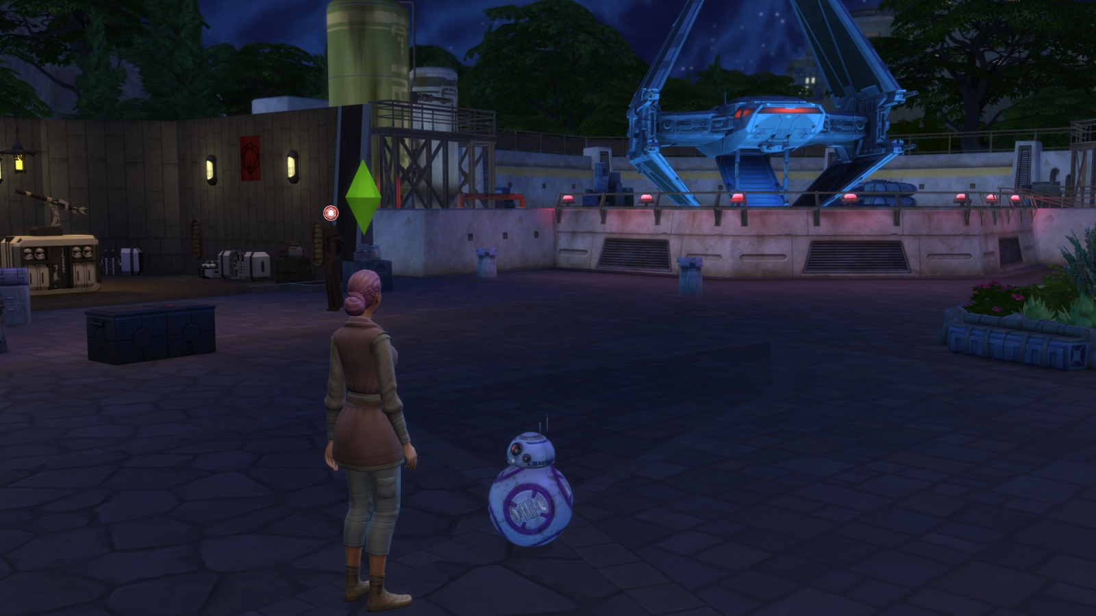 After fully checking out each section of Galaxy’s Edge…errrr I mean Batuu… I decided to take check in with The Resistance leader, Vi Moradi and start their quest line. Before too long, Rey (with an odd mix of a British/Simlish accent) makes an appearance and I got to practice my lightsaber skills with her. After being sent to spy on The First Order, my man Kylo Ren shows up. I can’t quite express in words how exciting this was for me! But even cooler than getting to play alongside these famous Star Wars characters, is the fact that you’ll soon build your own BB-8 unit that is fully interactive. He will help you out with your spying and quests, play music for you straight from DJ R-3X’s show, chat with you, and follow you around. I won’t spoil all the fun, but trust me you’ll want to build your own right away. You can do so by collecting scrap metal from scrap piles around the area, and once you have 10 you can build him in The Droid Depot in the First Order District.