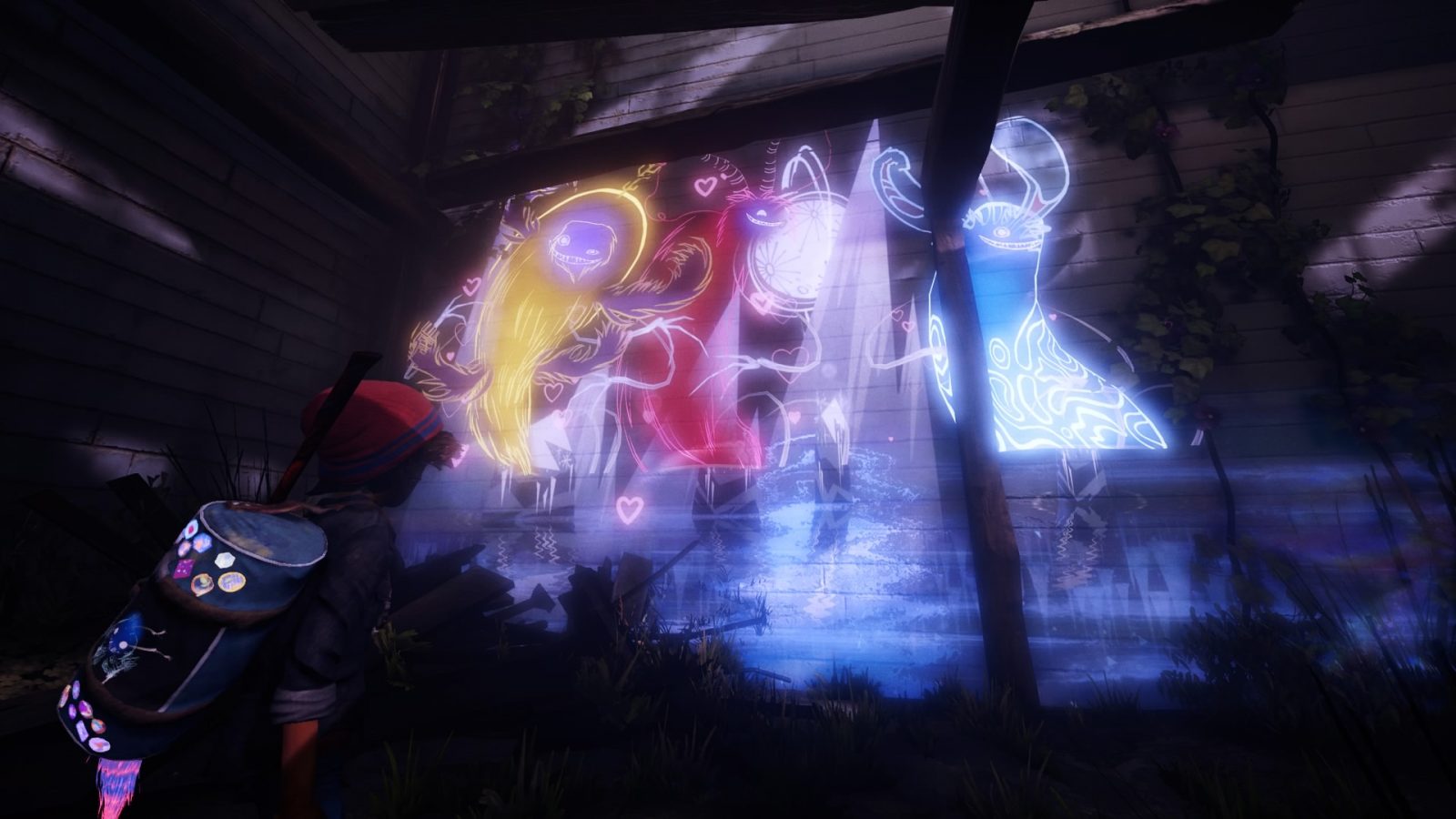 That being said, some of my best moments with the game were finding bare walls and covering it with art from the game’s limited selection of drawings (pine trees, stars, icicles, etc.). To progress, though, you need to find strings of lights to paint around and illuminate before you ultimately paint that area’s “masterpiece” that unlocks the next area. Those masterpieces can look neat but exemplify my larger issues with this system: how the game limits your creativity. I have no problem with the limited tools, but the masterpieces are instead dictated to you by Concrete Genie’s titular genies. These are Ash’s assorted monsters he’s sketched in his book that you find scattered around the world and serve as your companions of a sort. They affect the environment to allow Ash to progress, they refill his Super Paint meter which allows you to paint areas affected by the spreading darkness, and they request that you paint specific things to appease them. This often just felt like it was stripping away my ability to be creative by simply telling me which handful of sketches were necessary to move on. I understand wanting you to paint something specific, but instead of asking you to figure out what needs to be painted, the genies will explicitly tell you exactly what you need to do.