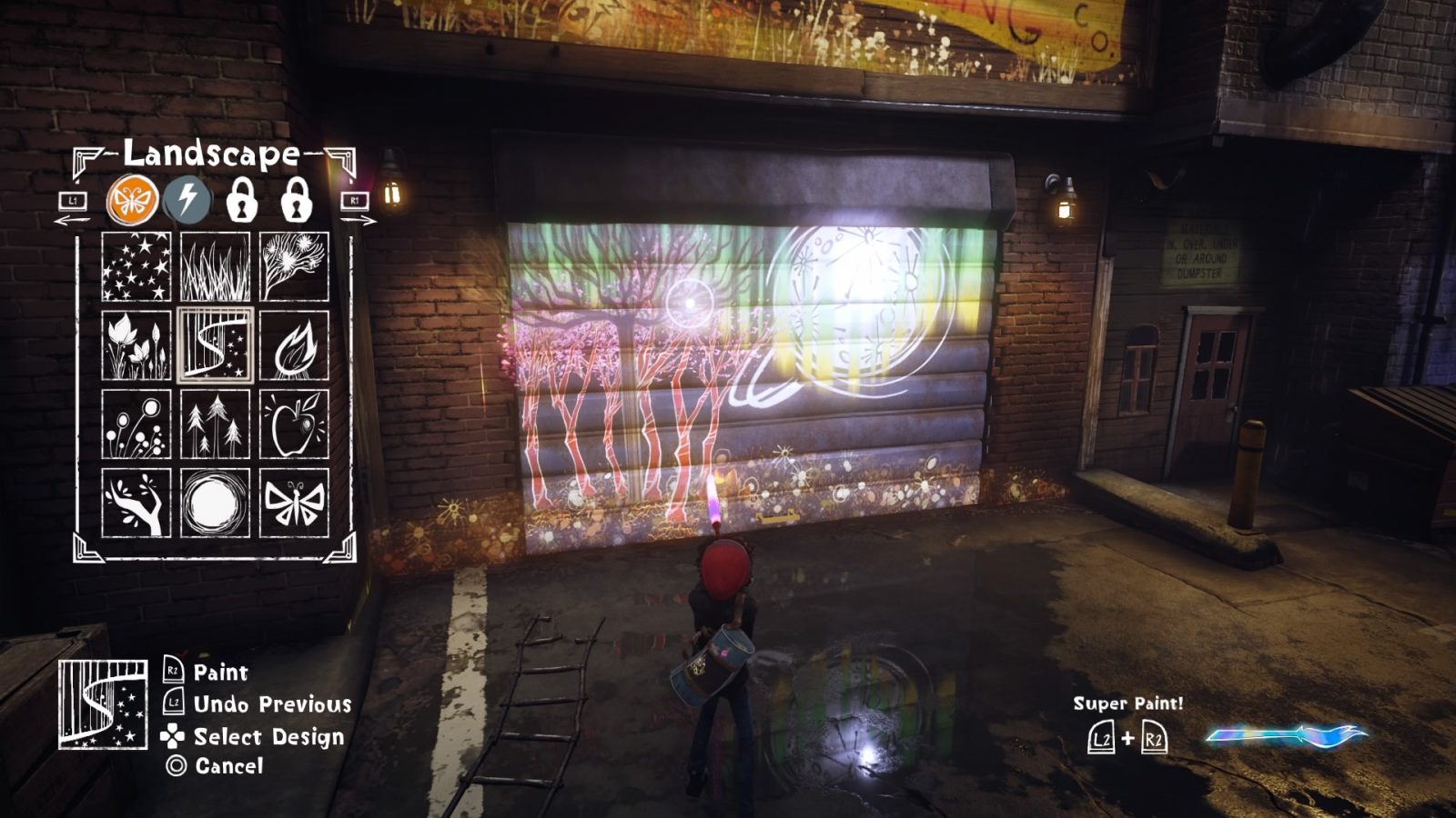 It’s a shame because the genius of its painting mechanic is that the art on the walls always looks incredible regardless of whether you choose the templates or not. That’s because they aren’t static images pasted onto the walls but rather glowing neon creations. The trees sway in the breeze, the stars twinkle in the presumed night of your painting, clouds cause a persistent rainstorm on the walls of Denska. I never got bored of plastering anything and everything on the walls and seeing what sort of scene I’d created.