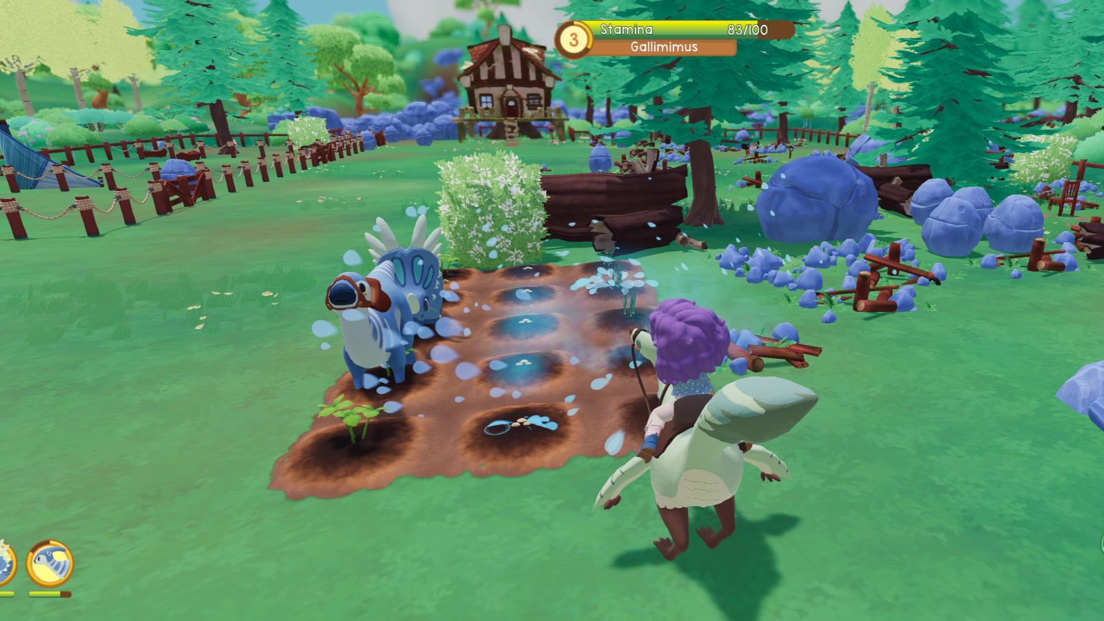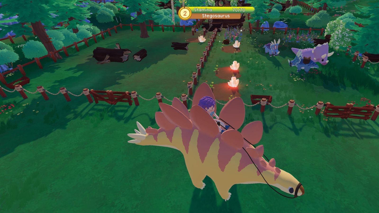 As I mentioned before, opening up the next area is the main quest you will start with. There is a giant log that falls between the two zones, and you need to find the correct dinosaur for the job. This is the Styracosaurus, and you’ll have to be with this dinosaur for DAYS in-game before she trusts you enough to put a saddle on her. You can do mini quests in town to earn money and items, but I felt like I was stuck for longer than needed waiting for her friendship to grow. I took her everywhere with me, and maxed out all the things that made her happy each day, and it still took me almost 6 real life hours in game to get her there. To the point I emailed the devs to ask if something was broken, or if I missed anything. For what it’s worth, I did everything right, they just choose to make friendship ridiculously slow.