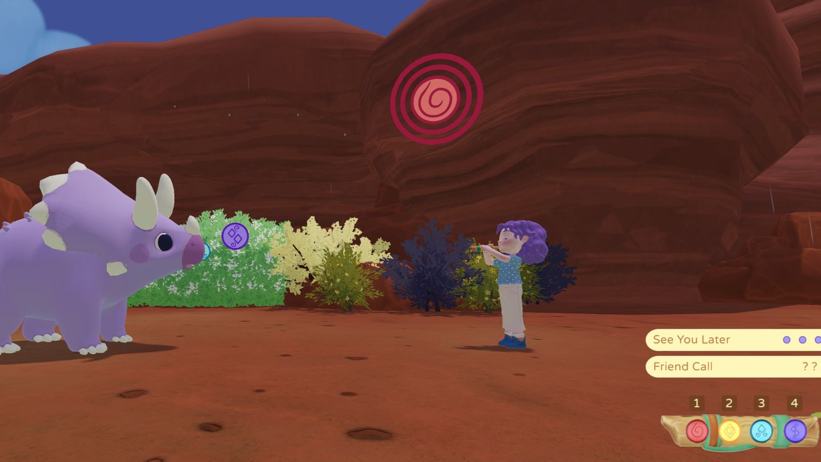 Acquiring wild dinosaurs is quite entertaining. You get a flute from a townsfolk early on. Each dinosaur has a song they sing, which is represented by four different colors. You need to match their song with your flute, both in color and tone. This can get tricky and takes some timing to get down with some of them, but I found it to be really unique. The dinosaurs are just precious, and you can play songs for them anytime once you befriend them. It was one of my favorite things about Paleo Pines.