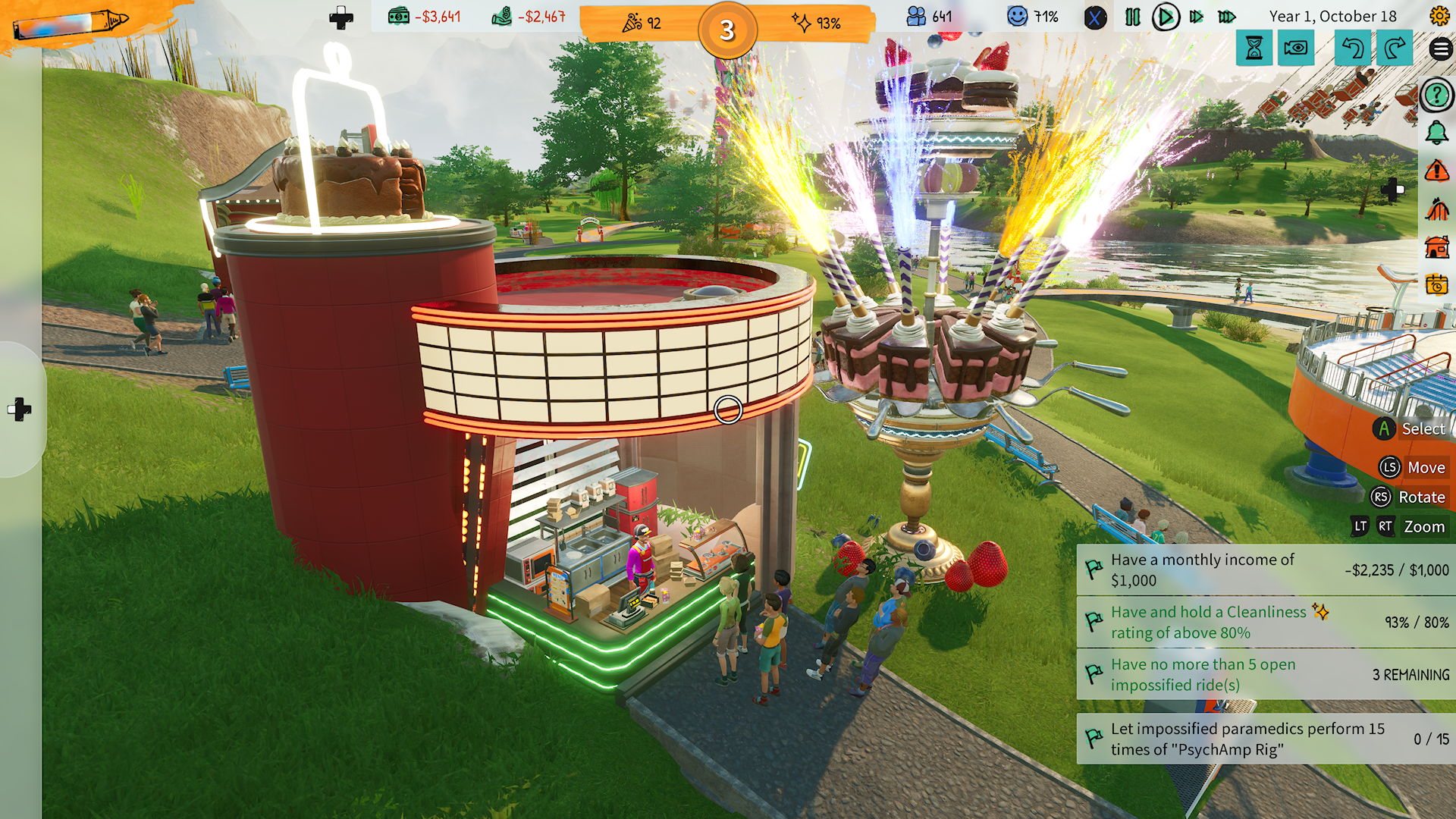 Your park’s Amazement rating is built up the same way Fun and Profitability are, by placing flat rides and coasters that have a higher Amazement factor (🤩). Rides like these will get the adrenaline pumping and probably even leave some of your visitors a little nauseated. However, these rides also contribute to how fast your Impossification meter fills up, which brings about a whole new whirlwind of opportunities for your rides and shops.