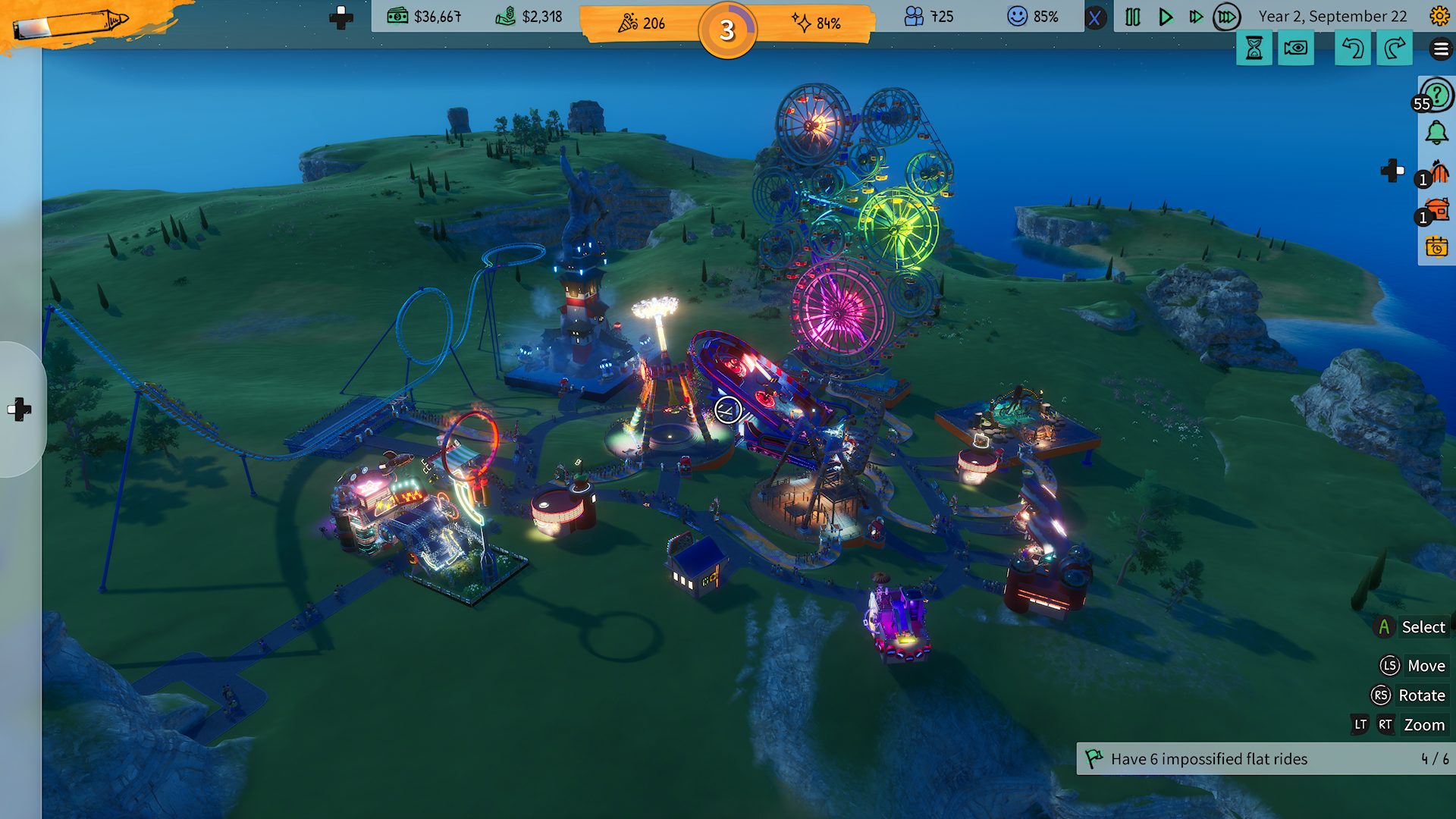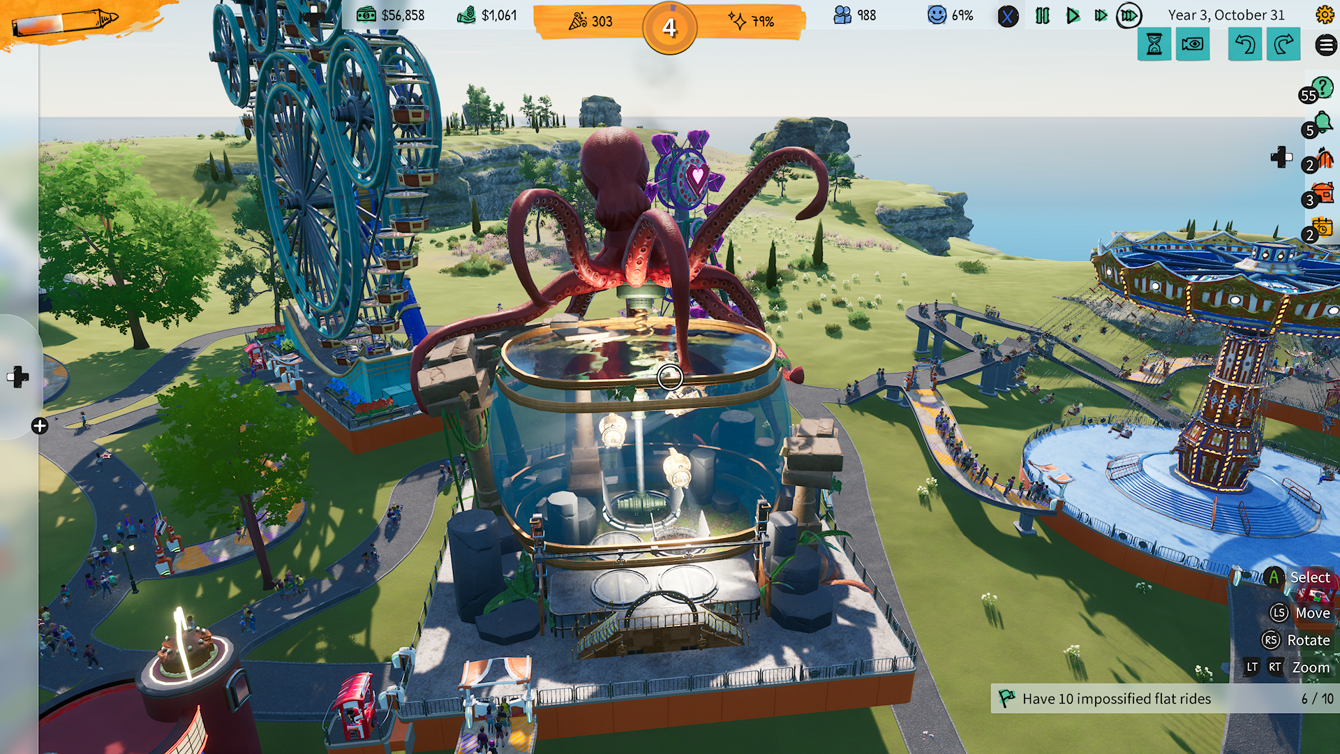 This still works out fairly well, even if your park doesn’t have a particularly high Amazement rating. All rides generate at least a little bit of each rating, so the Impossification meter will still fill up if you have rides focused on Fun and Profitability, it just takes a little longer. But even that doesn’t really matter as that just means you have more time to bring in the cash to be able to support the increased upkeep. You can also speed up the passage of time so you don’t have to wait as long between Impossifications, however make sure you’re still keeping your eyes on Profitability if you do this, because it can easily slip away if you’re not taking the time to monitor your cash flow.