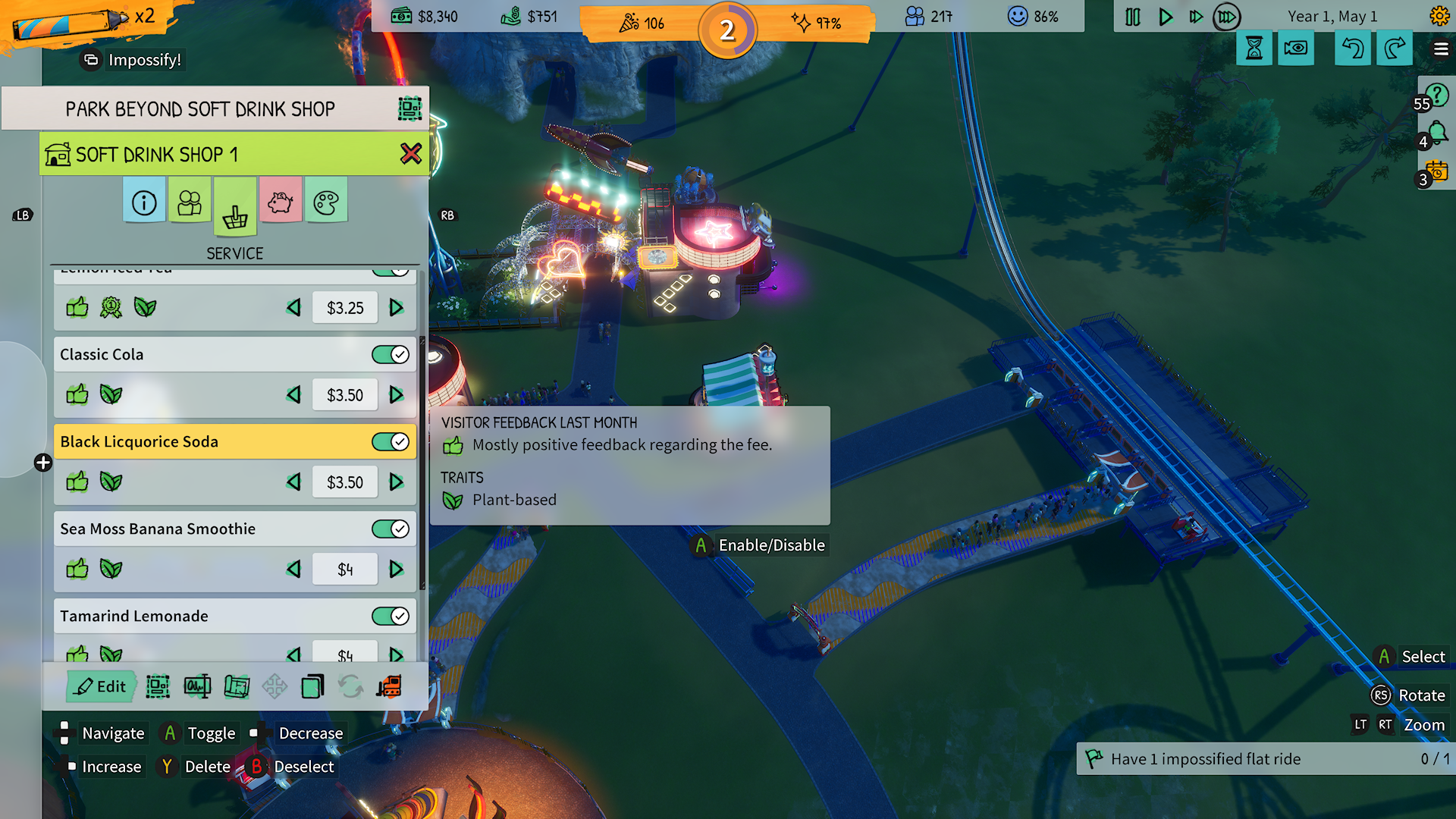 How things are Impossified has changed slightly since we did the preview. It used to be that staff members could be Impossified once the meter was half filled up and then rides could be Impossified when the meter was full. Now the meter has to be filled up so many times for each thing you want to Impossify. For staff members, the meter needs to be filled up once for every staff member you want to impossify. The meter must be filled twice for any shop Impossifications, and then it must be filled 5 times for any flat ride or coaster Impossifications.