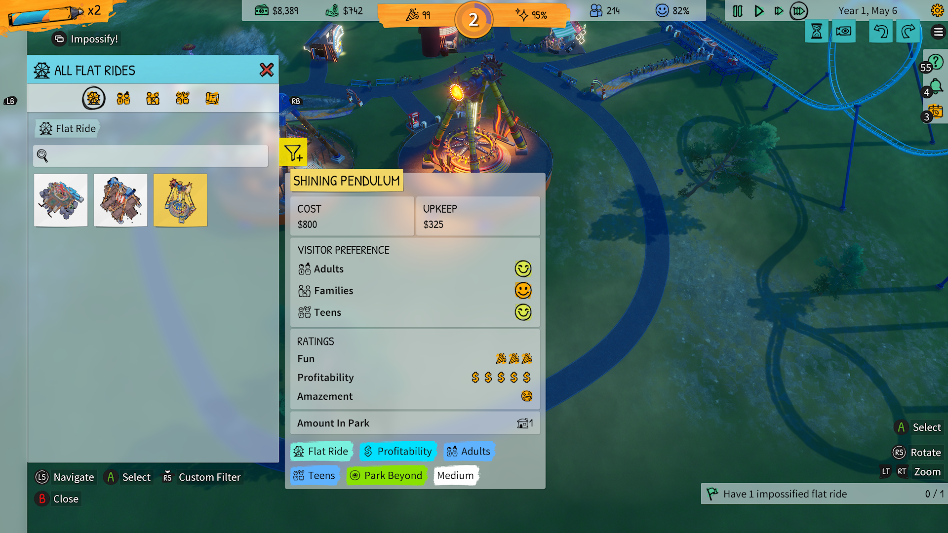 Your park’s Amazement rating is built up the same way Fun and Profitability are, by placing flat rides and coasters that have a higher Amazement factor (🤩). Rides like these will get the adrenaline pumping and probably even leave some of your visitors a little nauseated. However, these rides also contribute to how fast your Impossification meter fills up, which brings about a whole new whirlwind of opportunities for your rides and shops.
