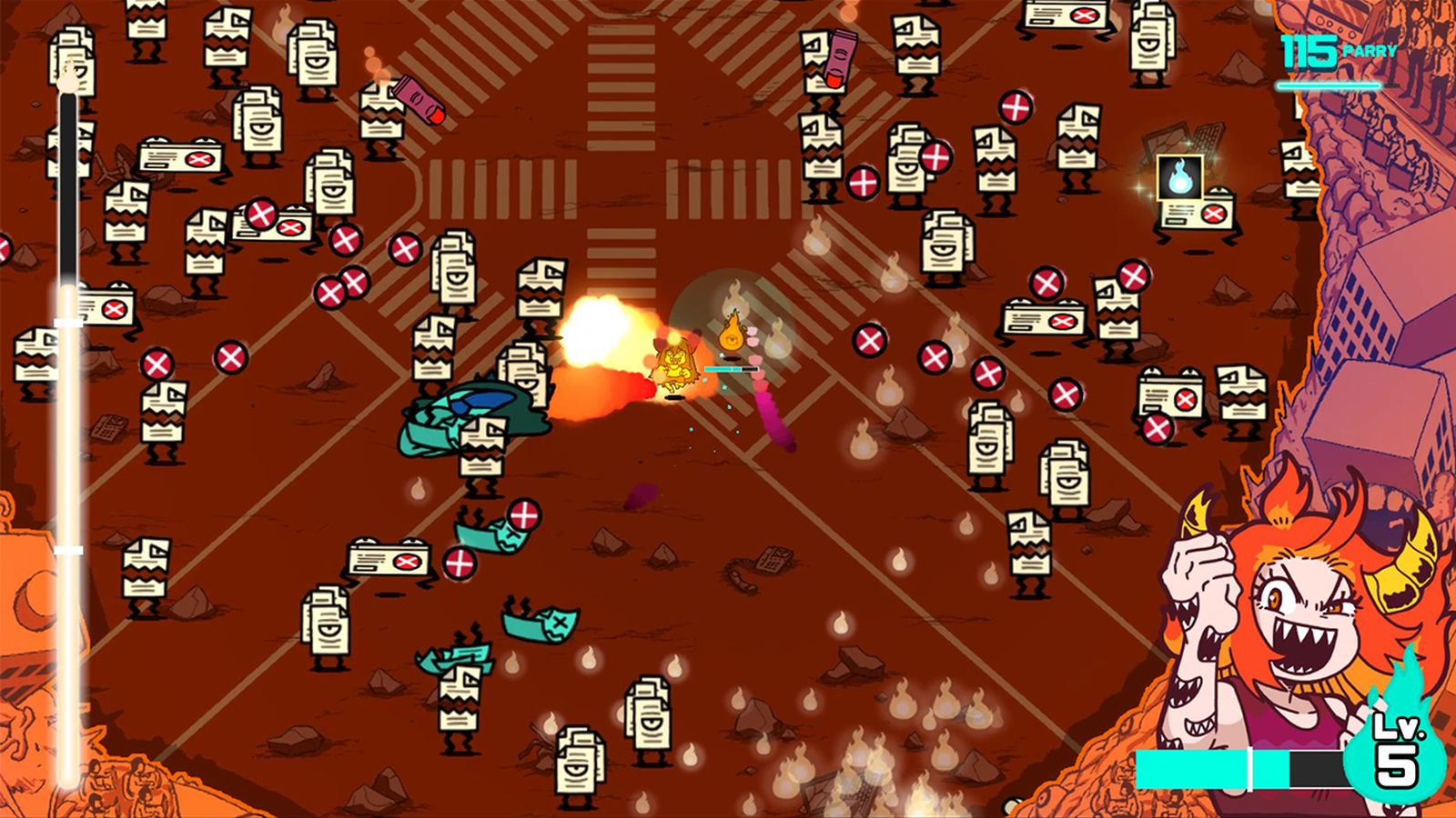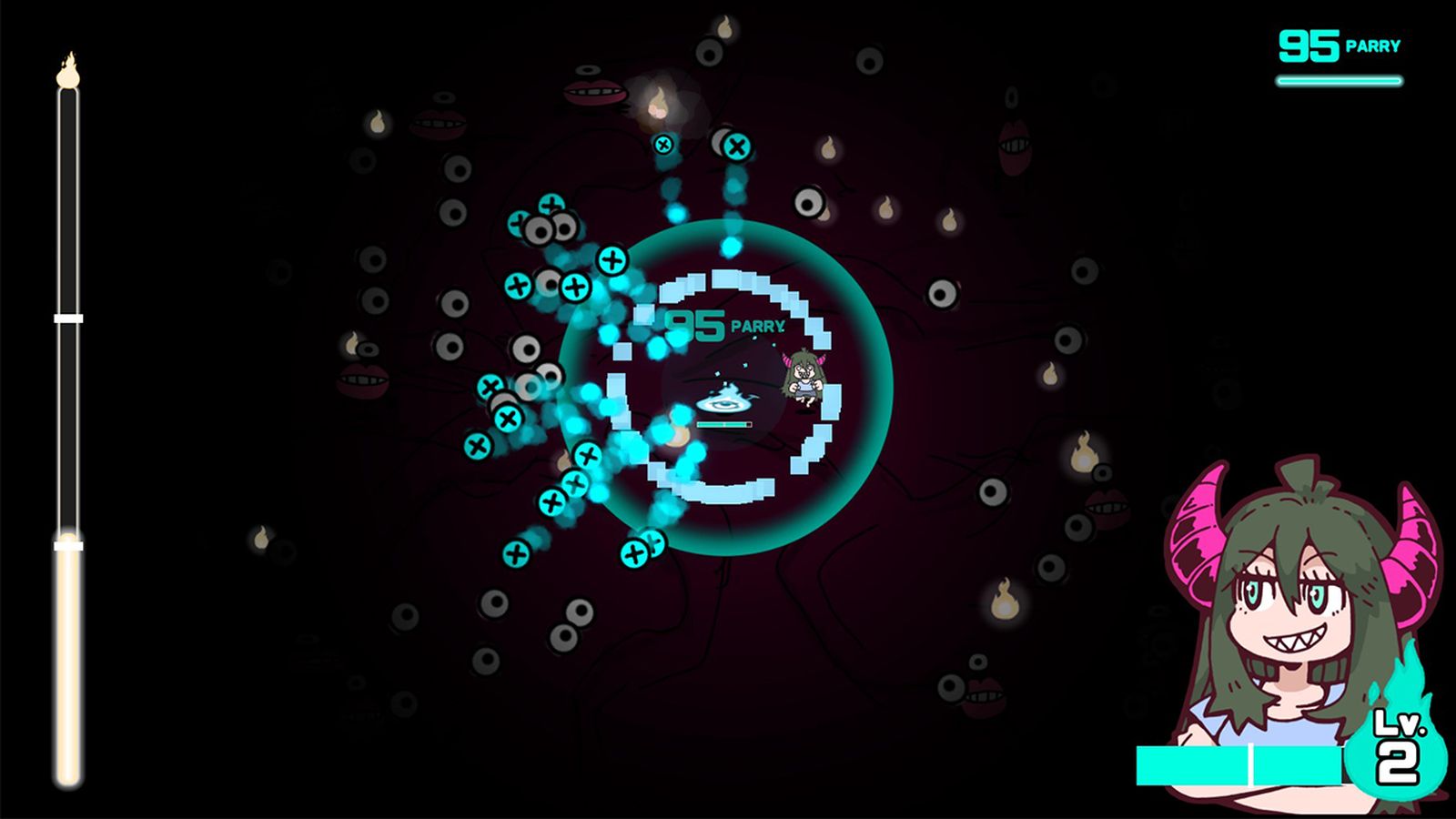 That being said, if you mistime your parry, then you’ll lose motivation and your parry will be put on a short cooldown. Even if it’s just a few brief moments, that’s plenty of time for trauma monsters to close the gap and attack, which will further demotivate you. This can really mess with your plans if you have a full motivation meter, because your pulse attack doesn’t get locked in, so you will have to briefly build it back up. Run out of motivation completely, and you’ll have to restart the level. Honnou can also be attacked, as bombs will try to chase her down and detonate. If you fail to parry them in time, then they will send Hannou tumbling away, thus giving downed enemies time to get back up. Standing by her side for a moment will revive her, so it’s not game over. To sum up, Parry Nightmare is all about the dual Ps and a T: parrying, positioning, and a healthy dash of timing.
