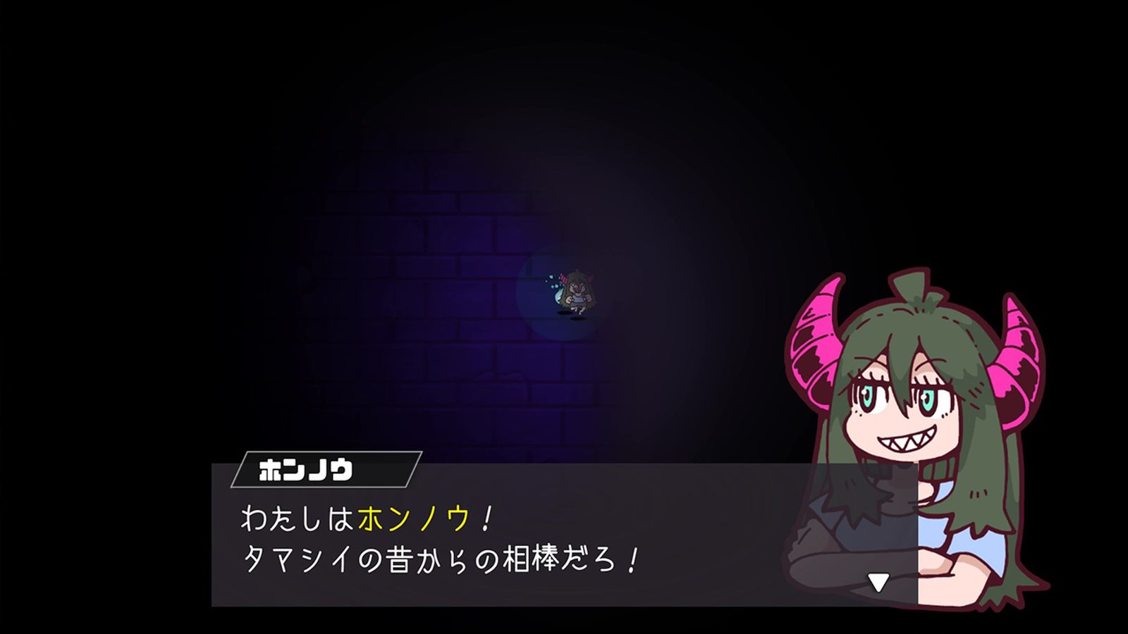 You play as an unnamed woman who, as the game’s title suggests, is facing constant stress-induced nightmares from overwork and past trauma. Nightmares take the form of circular arenas shrouded by a fog of war, and your traumas–which take the form of enemy combatants–are constantly closing in. However, you’re not alone in your plight, here to guide and protect you through various nightmare-scapes is Honnou-chan, whose name translates to “instinct” in Japanese, as she represents your inner self. She’s got hot pink horns, shark-sharp teeth, a chain bolted into her chest that links her to you, and mouths on her hands—what’s not to love?