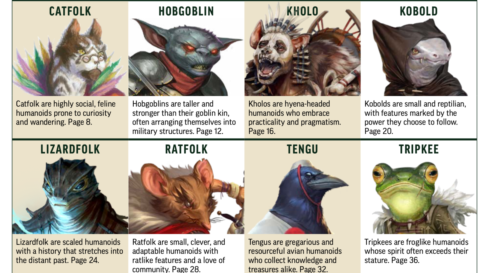 The ancestries outlined in PC2 seem to lend themselves to the animal folk with a series of anthropomorphized options for players to take out on the road. This includes things such as catfolk, lizardfolk, and the frog like Tripkees. Each ancestry gives players unique features surrounding their race of character. PC2 also adds in three new versatile heritages available to any ancestry. Players can imagine one of their parents being a vampire, descending from a line of dragonbloods, or even a duskwalker who skirts the lines between life and death. Also included are a few pages of common and rare backgrounds that characters can assume to help with their character development, each giving special stat boosts and/or skill feats during creation.