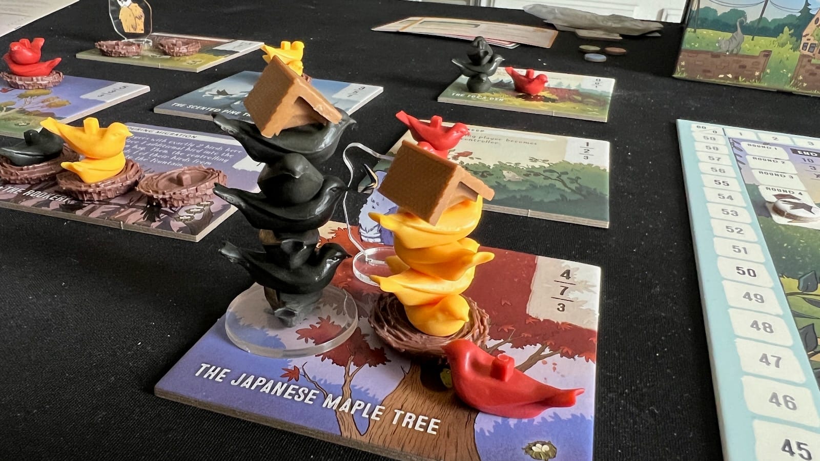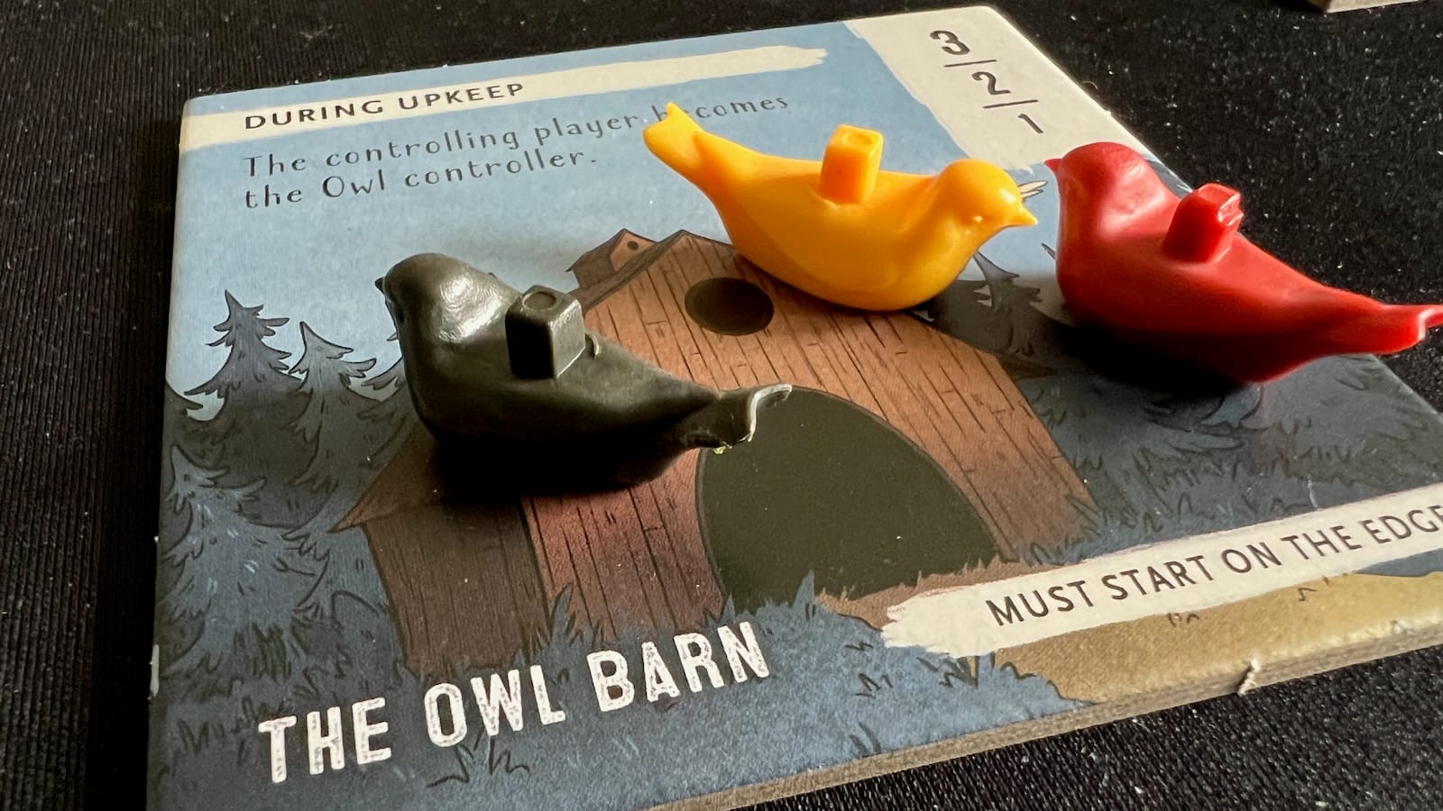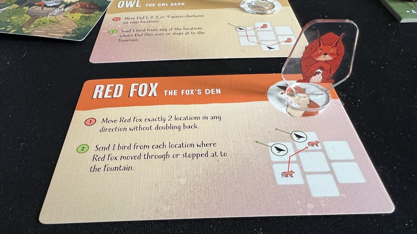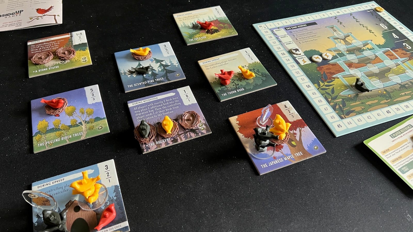 After all birds are placed, each tile will be evaluated for points and special bonuses. Some of these bonuses can add extra birds to the bag for the next round and add unique scoring conditions. Other tiles can send birds to another fountain board and some will gain players control of Homestead Creatures. The game comes with nine different creatures that have special abilities that can be activated once per round. These creatures can move birds to other tiles, scare them to the fountain tile, and even bounce them back to the supply. For example, the owl prowls around the edge tiles and sends a bird to the fountain from the tile they land on. Players can manipulate the creatures to help gain a majority by sending an opponent bird from a tile or secure a prime fountain spot by sending one of theirs off.