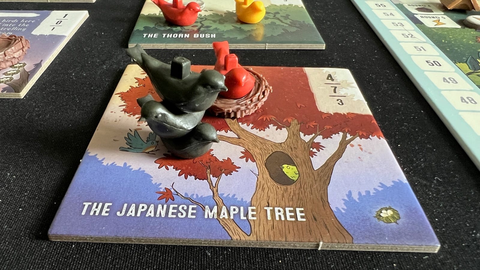 One of the best parts about Perch is the randomized set-up at the beginning of the game. Depending on your player count, you will take various basic, specialized, and creature tiles, shuffle them together, and create a central playing area of alternating two and three tile columns. Each of these tiles will be evaluated for the number of birds on them at the end of each round and will award points and potentially other advantages to the player with the majority. Some of the tiles will have nest bases placed on them, which count as an extra bird for the player that claims it.
