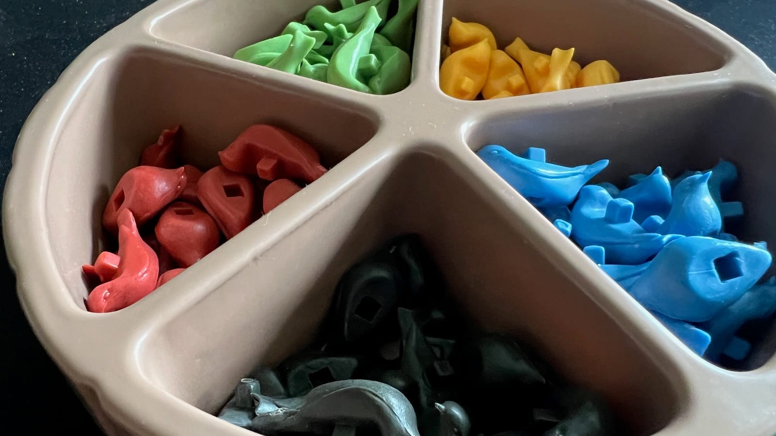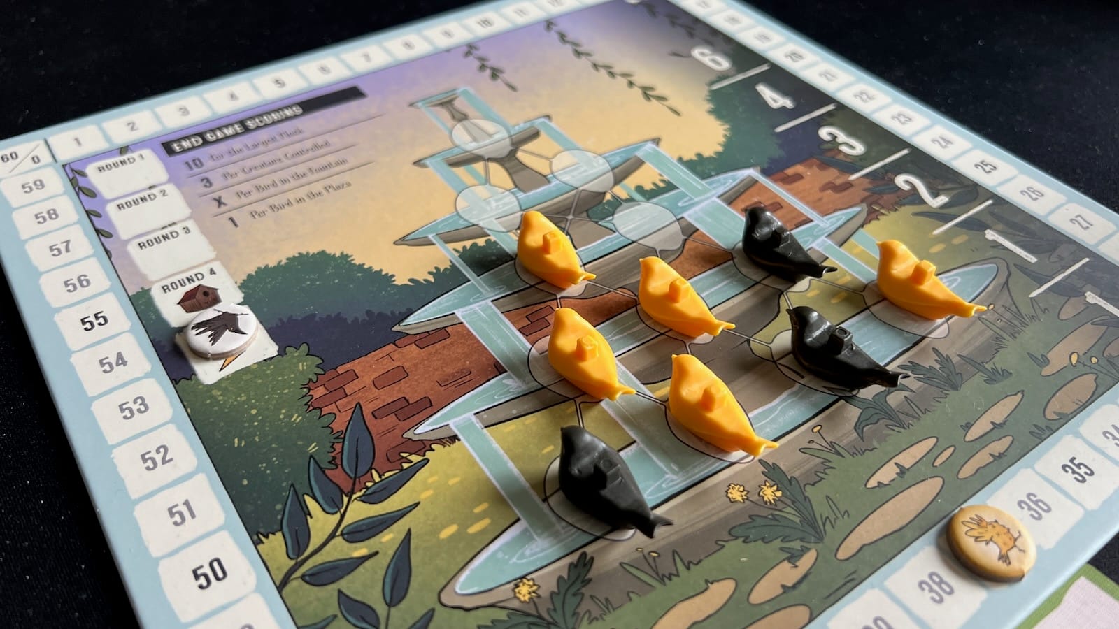 After five rounds, final scores are tallied. The player with the biggest flock on the board gets 10 points. Players earn three points per creature they control, points from fountain and plaza birds, and any points from objective cards passed out at the beginning of the game. The player with the most points wins.