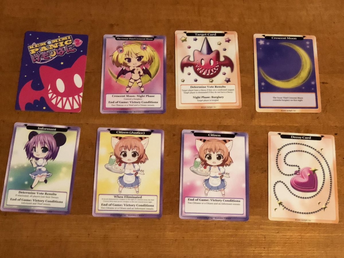 In Kemomimi Panic, four to eight people play as citizens of Mokemoke. A burglar is on the loose stealing women’s jewelry at night. At the beginning of the game each player gets a role card, a character card, and a decoy card. The role card indicates if the player is the thief, a citizen, or the Informant. Some of the citizen cards don’t offer any special abilities, but a few do have ones that go into effect after the character has been eliminated, like causing other players to lose their Decoy card or not allowing the thief to strike during her next opportunity.