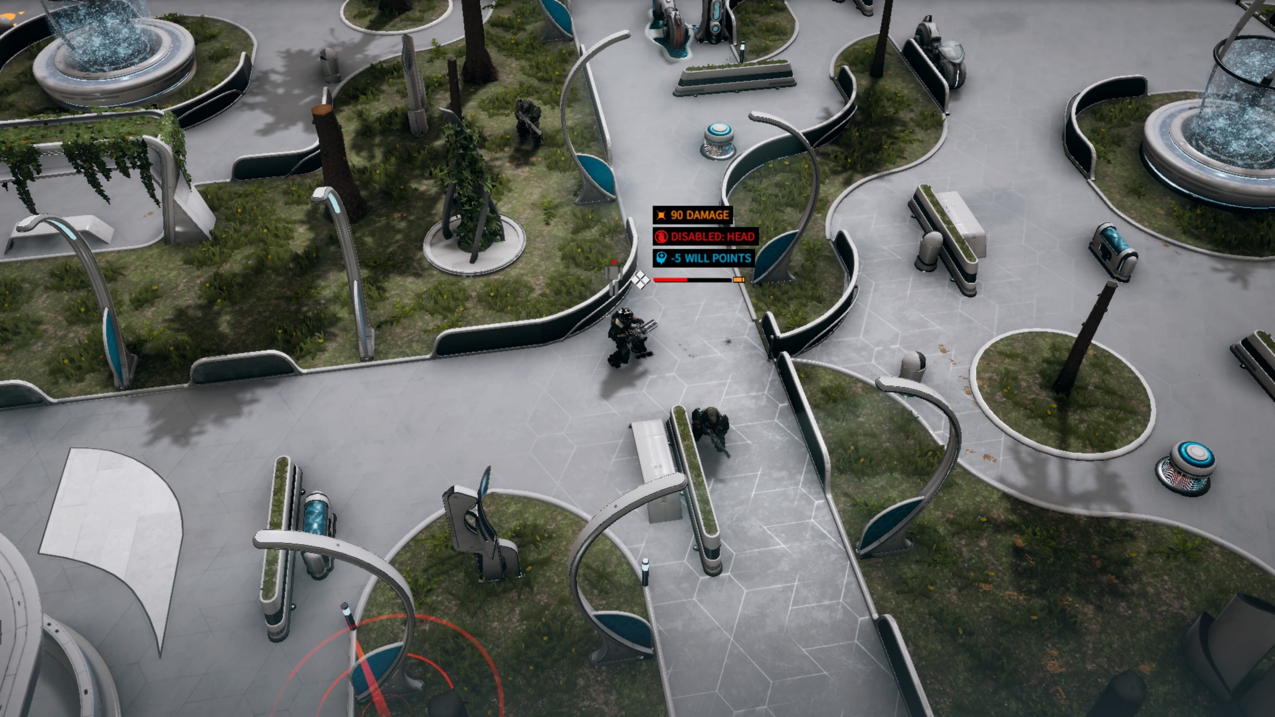 Controlling your troops on the battlefield works great. To move, it’s as simple as using R1/L1 to select your unit, and pressing X to move to the selected tile. The UI helpfully indicates the maximum distance you can move if you still want to fire a shot. Shooting is also user-friendly; simply press the L2 button to line up your shot, and cycle through targets in the same way you would cycle through your units. Free-aim, Phoenix’s Point’s unique mechanic that allows you to target particular body parts of your foe (think Fallout’s VATs system) for specific advantages works just like any other shooter. You can also select other abilities using the directional buttons.