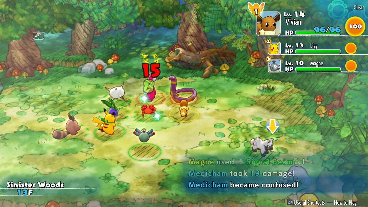 In dungeons, everything takes place on a grid. Most Pokémon take up one square of that grid, and each character can take an action, such as moving, attacking, or using an item, once their “turn” comes around. I say turn, but it’s not entirely turn based. Yes, while nothing will happen unless you take your turn, you’re never waiting around for enemies off screen to move before you can do something. Unless you’re in combat, it feels like everyone takes their actions at the same time. Your main goal on each floor is to simply find the stairs, but you’ll want to explore and find items to help you survive. You can find items that restore health, food to stave off starvation, cure statuses, debuff foes, or even change the layout of the dungeon itself. You’re unlikely to face defeat in any single encounter, but the real challenge comes from managing your resources efficiently. You might not have packed enough food for the journey, and end up going hungry, taking constant damage while you scavenge for apples. It’s a lot of fun to go into a long dungeon with tons of resources, only to end up really thinking out who really needs to be healed or if it’s worth trying to pick up that item with the sleeping Pokémon next to it. One resource that I didn’t really need to manage was Power Points. Whenever a move ran out of PP, I had a plethora of ether to restore PP at any given moment. By the end, I had over 50 PP restoring items and at least two pages of inventory filled with the things. Dungeons are absolutely filled with them, so you never need to worry about running out of moves. Personally, I would have enjoyed having another resource to manage, but I can see how children may find that mechanic frustrating.