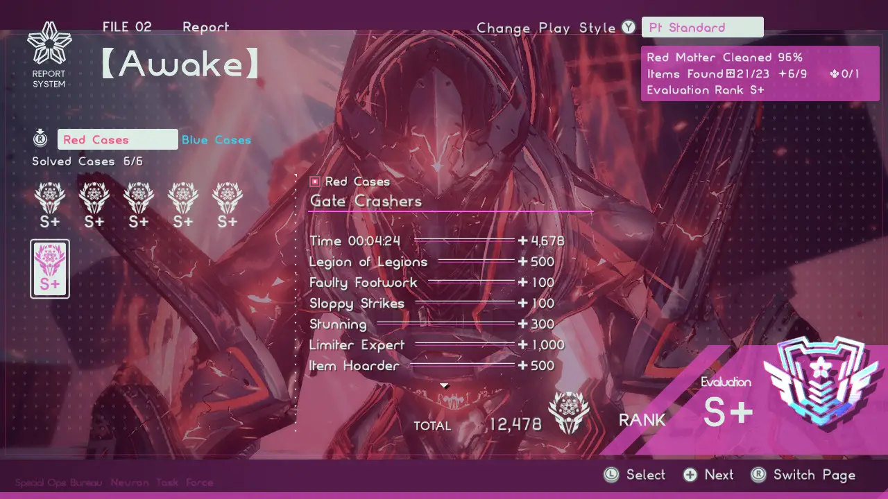 When I mentioned that Astral Chain has bits of other Platinum games in it, I don’t mean that metaphorically. For example, the followup attacks after a combo or dodge feel like they were lifted straight from Transformers Devastation, the short slow-mo you enter after just barely dodging an attack is essentially Witch Time from Bayonetta, and the finisher you can perform on most enemies that also heals you works the same as in Metal Gear Rising: Revengeance, same for the Blade Legion’s precision cutting mode. If you’ve played a Platinum game before, you’ll find something that you’re at least familiar with here. In my first playthrough, I played on the PT Standard difficulty and, while I did find it a bit too easy at times, it feels like the right difficulty for learning all of the games mechanics. I think it would have been a bit too hard to, say, move your legion around the battlefield for the first time while also attempting to dodge devastating attacks you’ve never seen before. Enemies can hit quite hard, often taking about a third of your health bar in a single hit. You’ve got plenty of items to heal and support you now as well, especially since using items no longer incurs a score penalty. This does make it laughably easy to get an S+ rank on each case, or encounter, skipping cases also doesn’t seem to affect your score too much either. Of the few missions I’ve played on the PT Ultimate difficulty, which is unlocked after finishing a mission on PT Standard, it’s not too much harder either. This means one of two things: I’ve gotten very good at character action games over the years, or Astral Chain is designed mostly for newcomers to the genre. As much as it hurts my ego to say it, I believe it’s the latter. The game starts you off on Casual difficulty and includes an Unchained mode which can automate some parts of combat. It really is the perfect game for people to start with too, it has elements from other games in the genre and has a lot of variation in its gameplay. It’s like the Kirby Superstar of its genre: everyone can find something to like and play another game that emphasises that part of the gameplay.