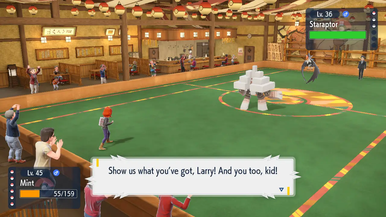 You can use your Tera Orb’s charge to activate a single Pokémon’s Tera type, which can be different from their main type. This gives them a boost in stats and a jewel-like sheen along with a hat to represent their new type. It’s not used particularly well in game, but it has some neat potential like, for example, changing a Dragon Type into Fairy to eliminate their weakness and catch your opponent off guard. That would only work with real opponents, however, as the AI is still dumb as a rock here, implementing exactly 0 strategy.