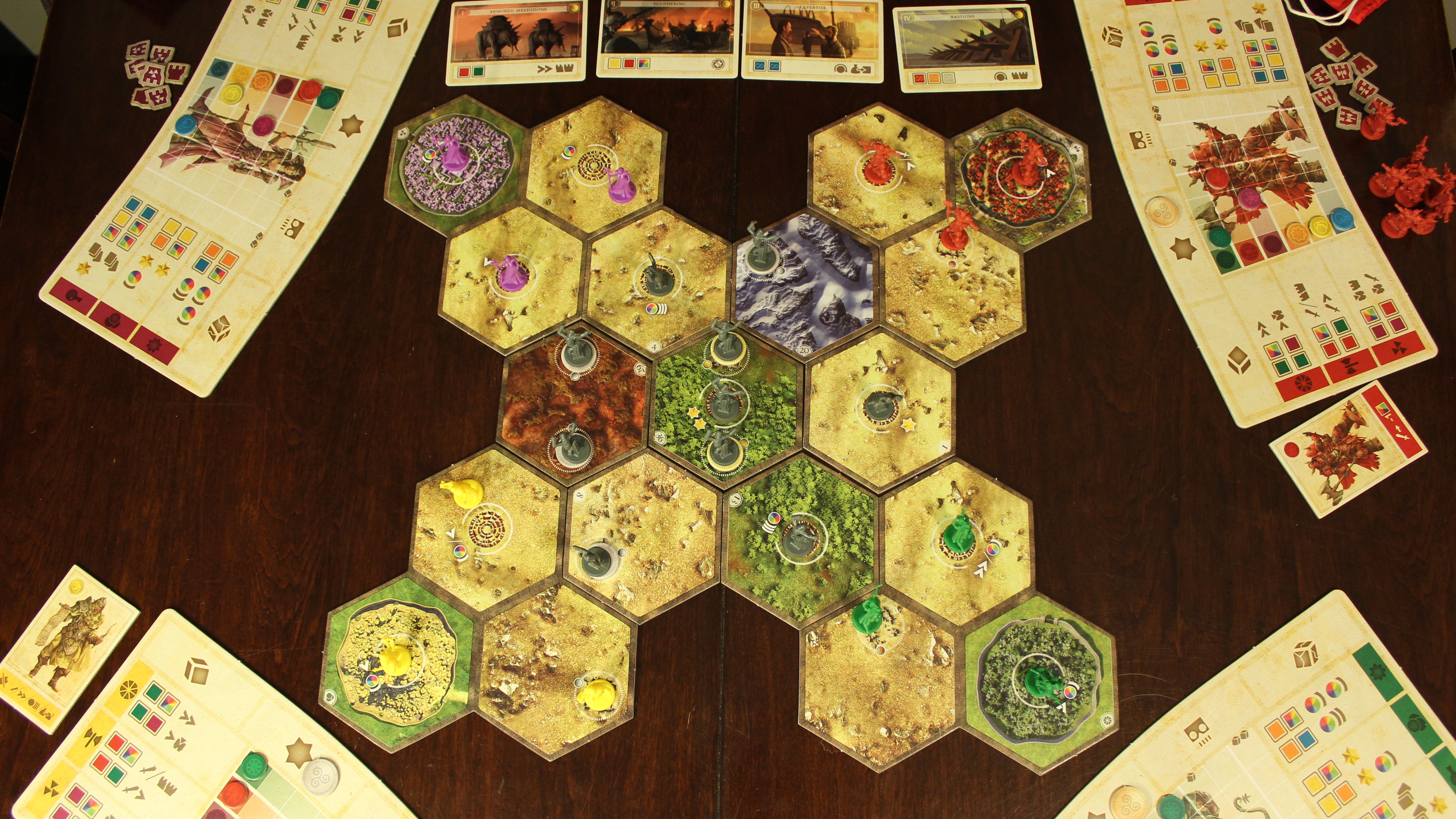 Most of the action in Hyperborea takes place on an array of hexes that make up the landscape. Every game has a similar set up with a central hex, a ring of six unknown tiles and then the individual player’s home lands around the edges. Each tile has some sort of terrain type associated with it and either a ruin, a city or both. Ruins are used for one time perks by whoever gets to them first, and cities can be utilized over and over by the player who controls that tile.