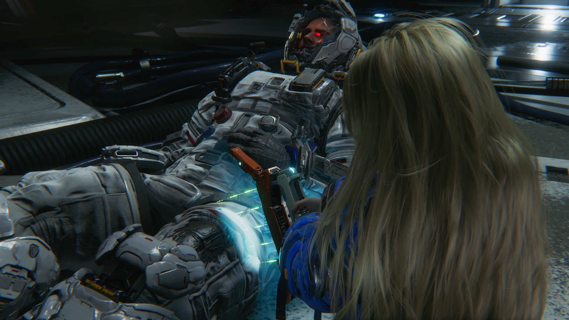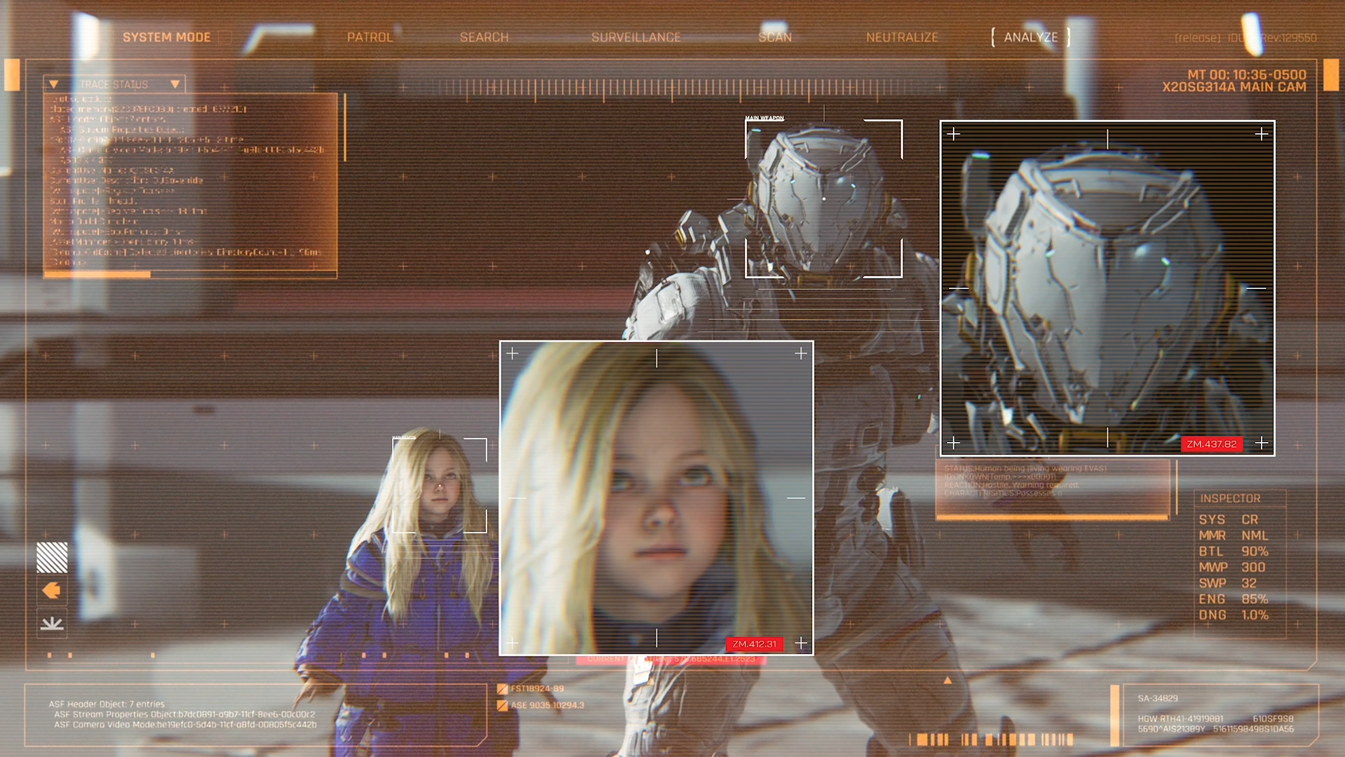 PRAGMATA are more than just robots, which are also found throughout the facility. A PRAGMATA is a fully sentient humanoid that can express emotions and articulate thoughts and opinions after receiving new information. Diana is full of excitement over working with Hugh and finds joy in conversing with him, particularly when he's talking about his life back on Earth. You'll find various REMs (Read Earth Memories) throughout the base, which can be displayed back at the Shelter and give Diana little glimpses of what people do for fun on our pale blue dot, like watching tv, building sandcastles, and playing different games.