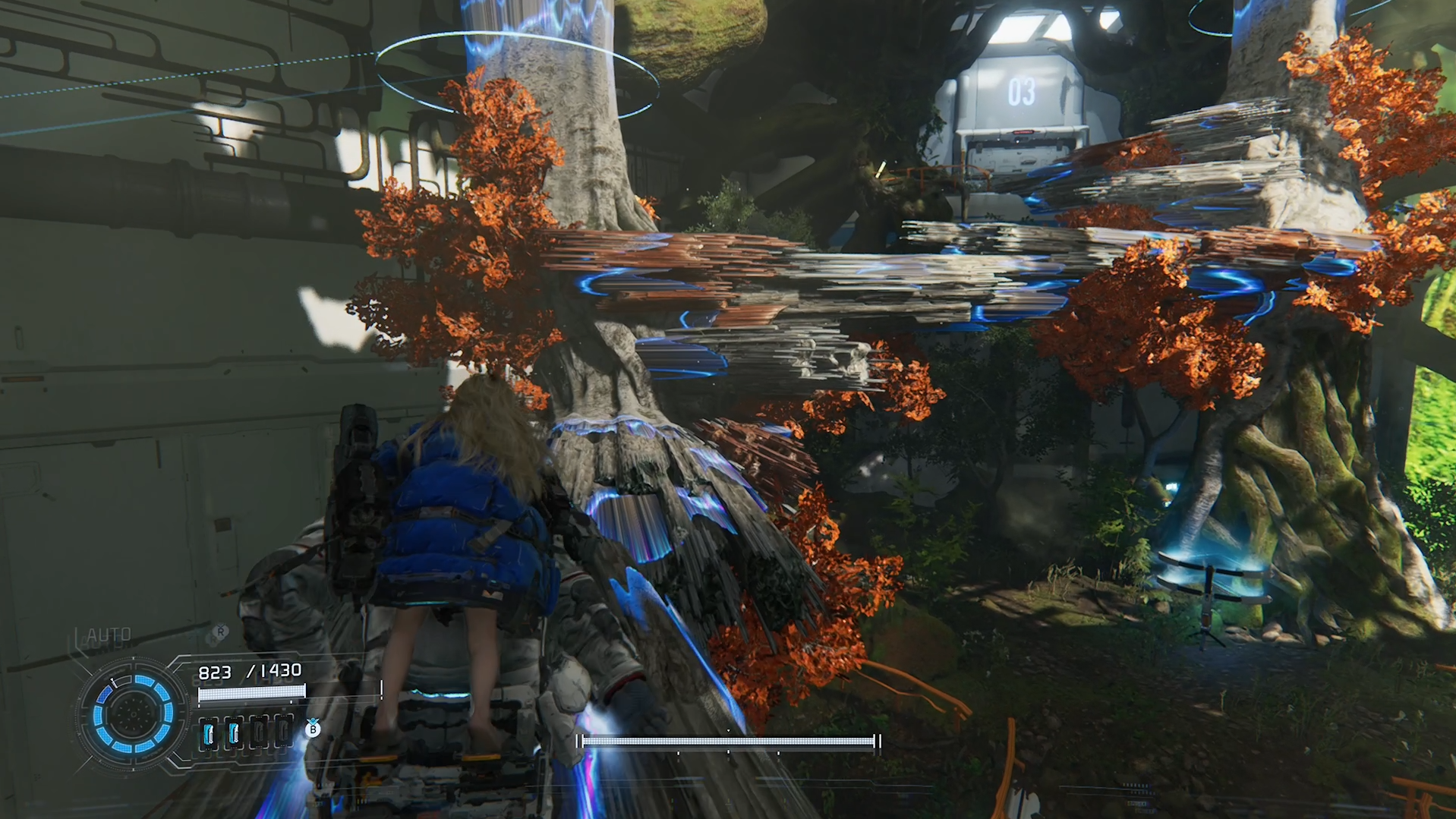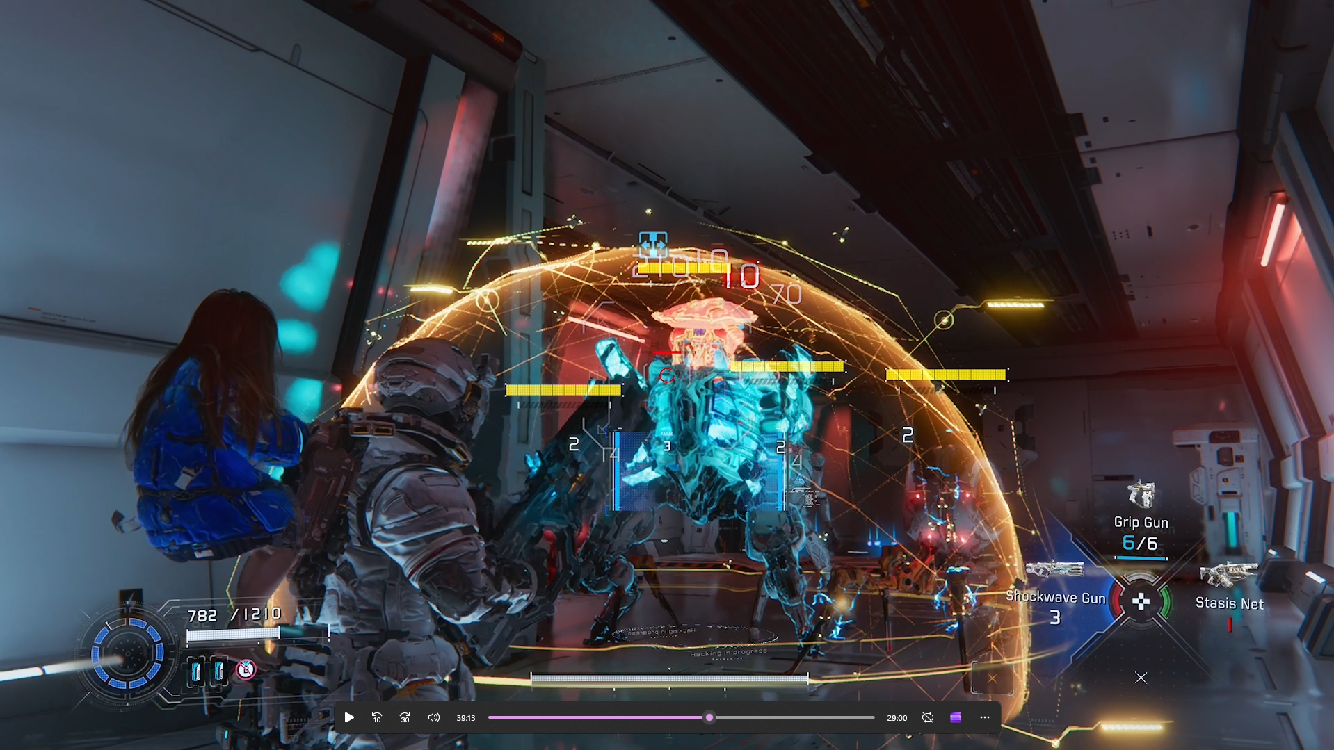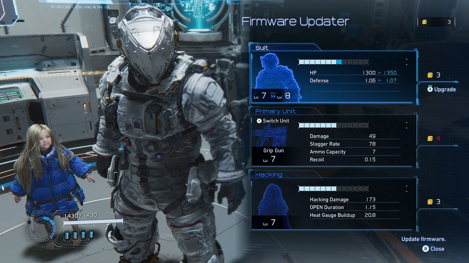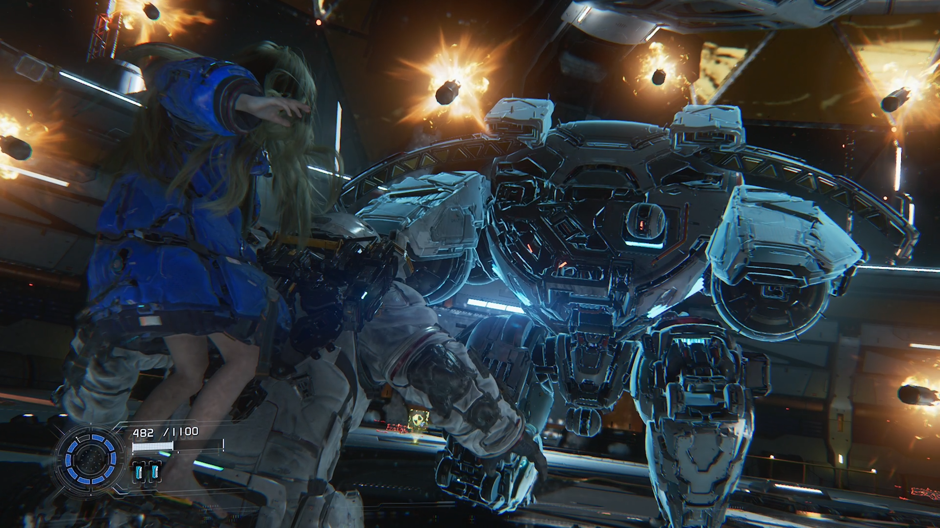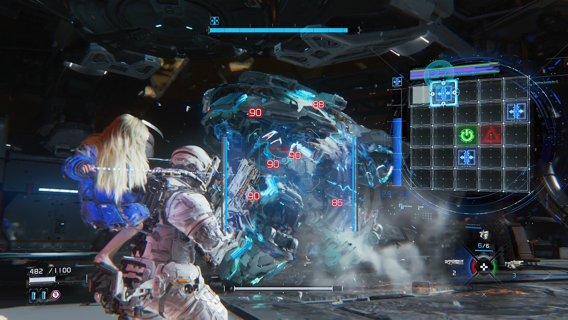 PRAGMATA is a third-person action-adventure game that combines shooter gameplay with hacking and RPG elements. Hugh finds and equips himself with various weapons and support tools that help him take on the many different hostile robots he encounters throughout the facility. Each is able to be leveled up by collecting lunafilament from defeated enemies and caches scattered about. He's also able to jump, hover, and dash around in his fancy spacesuit. Diana helps him by creating vulnerabilities. Aiming at a robot brings up Diana's hacking matrix, where you have to navigate around a grid, hitting special effect nodes on the way to a green node that opens up enemies to critical damage. There are also blocked nodes and red nodes that have to be avoided. The action around you continues at full speed, and you can even continue shooting while trying to navigate the grid, but if you take damage or hit one of the red nodes, the grid resets and you have to start over.