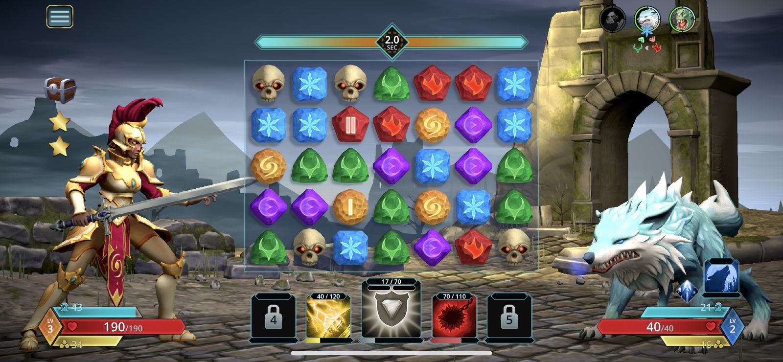 As I said before, this is a match-3 puzzle combat game – you make matches of 3 or more gems of the same color – but what sets this one apart from similar games like Puzzles & Empires and Candy Crush, is that you are able to make multiple matches per turn. You are given an initial timer of 2 seconds to make your matches before you actually make your attack. Every match you make increases the timer slightly allowing you to make more and more matches until the timer runs out or you run out of available matches. Matches can be made via the standard horizontal and vertical movements, but you are also able to make diagonal moves as well. Every match you make fills up meters of corresponding spells and special abilities that are lined up at the bottom of the screen. Once the meter fills, you are able to unleash a devastating attack, get a buff, or get some of your health back.